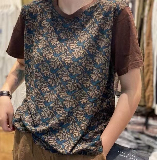 Age-reducing retro print slimming and flesh-covering short-sleeved T-shirt