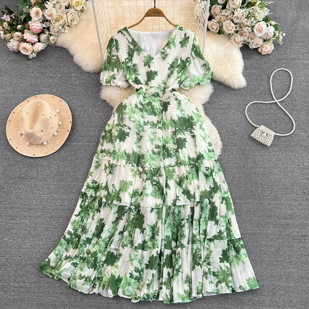 Age-reducing retro women’s summer V-neck loose pleated floral skirt