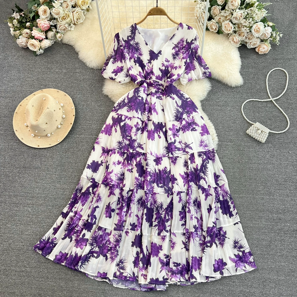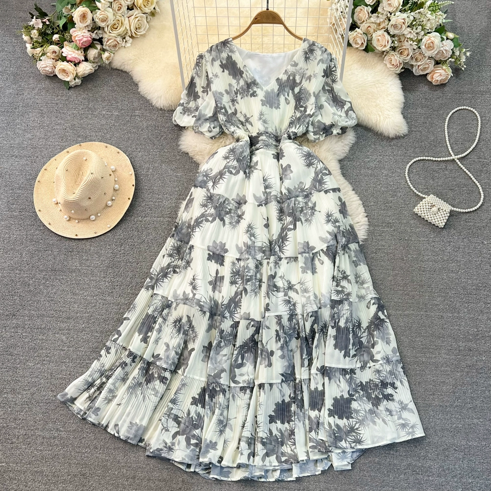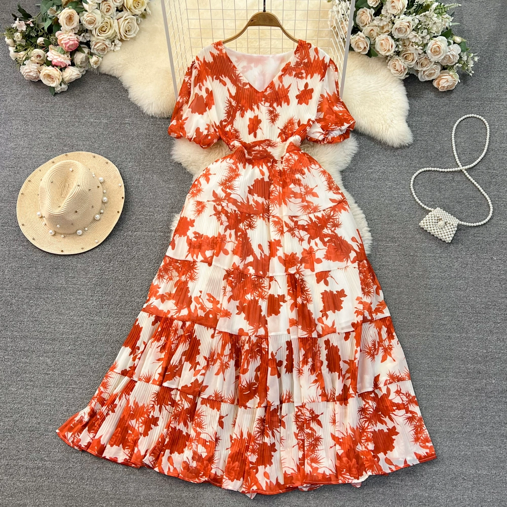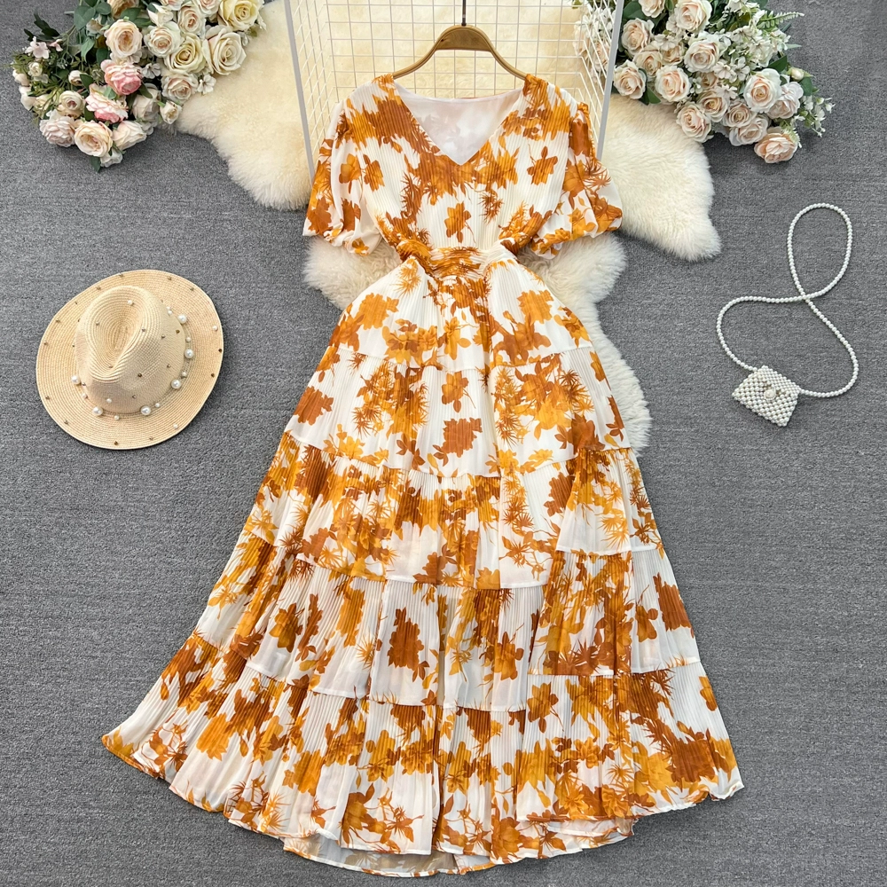 Age-reducing retro women's summer V-neck loose pleated floral skirt