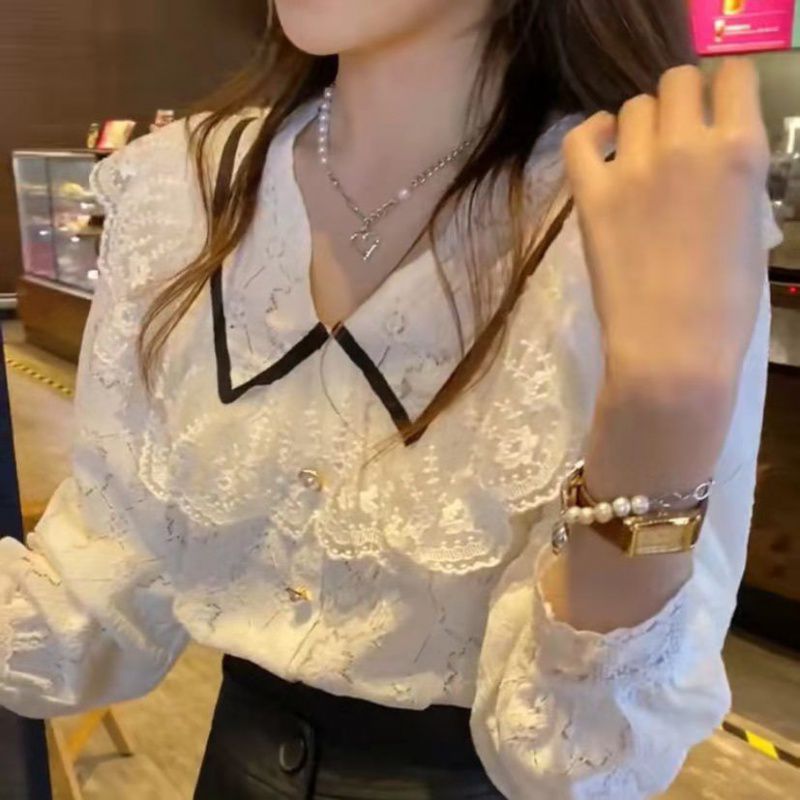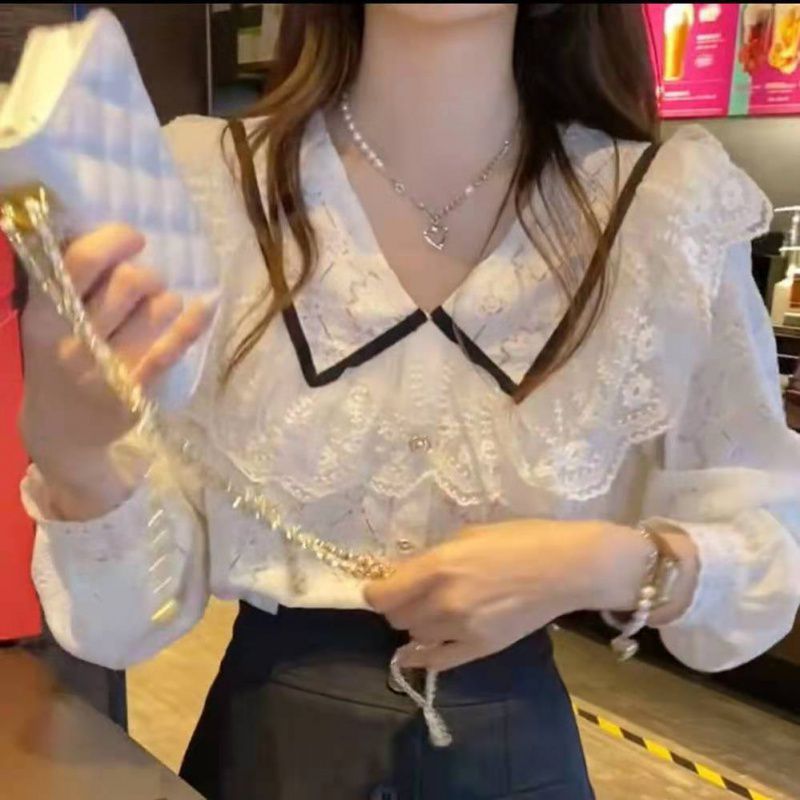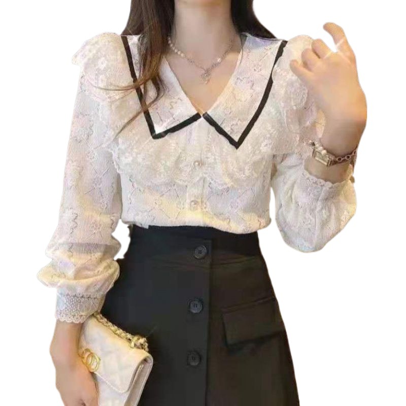 Age-reducing Ruffled Lace Top Women’s 21 Autumn New Korean Style All-match Fashionable Loose Slimming Lace Shirt