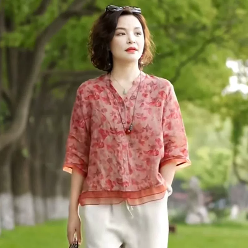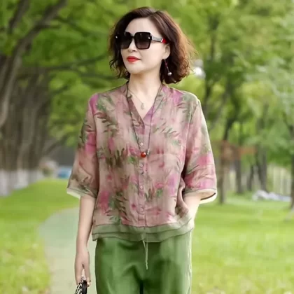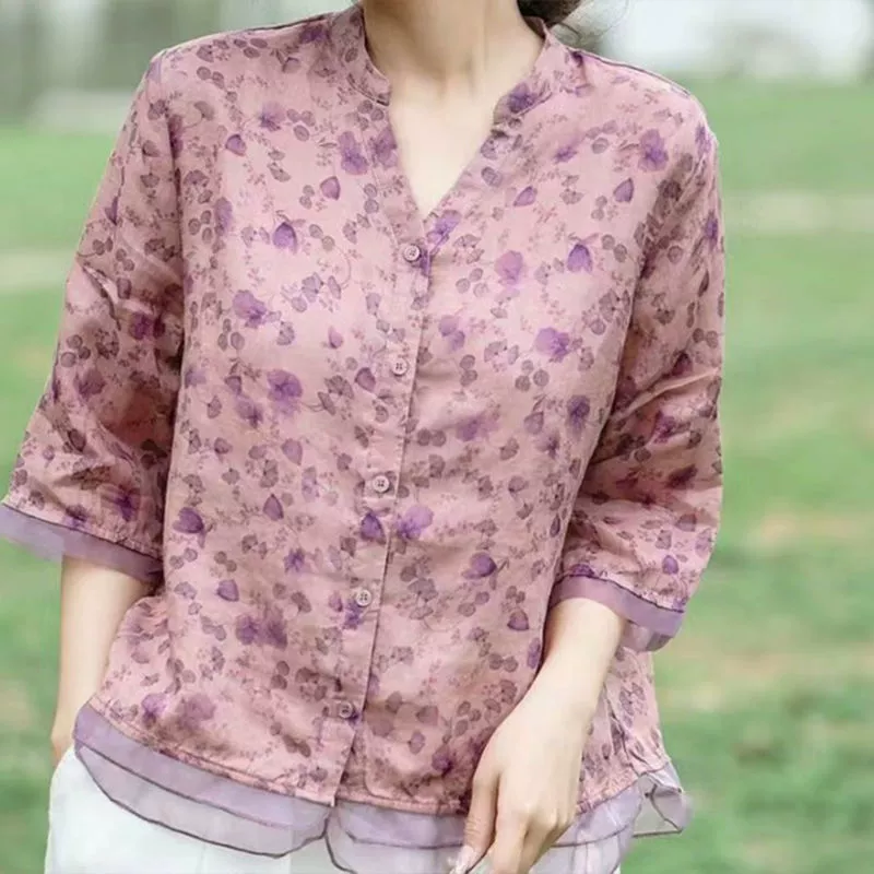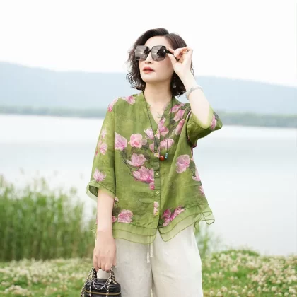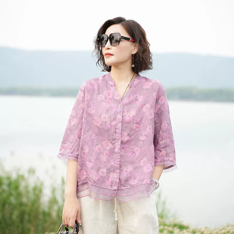 | nameOriginal | Age-reducing V-neck casual floral ramie mid-sleeve cardigan |