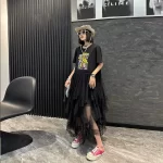 Age reduction and weight gain stitching mesh dress black cartoon