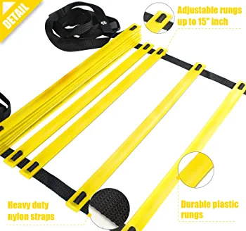 This agility ladder is crafted from premium quality PP material and heavy-duty nylon straps, ensuring durability for years of training. It is perfect for various sports such as soccer, football, athletics, hockey, and tennis. The ladder is lightweight, easy to store, lay out, and put away, making it convenient to take with you wherever you go. With 13 rungs and an overall length of 23 feet, the rung distance is adjustable to meet your workout needs. This ladder is ideal for improving your athletic performance, including acceleration, leg strength, speed, core skills, balance, rhythm, and body control. You will receive one agility ladder, a carrying bag, and hassle-free customer service. This ladder is an excellent tool for enhancing your footwork, coordination, and agility drills.