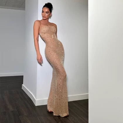 | nameOriginal | Ahagaga European and American style sexy nude mesh see-through dress, high-end light luxury hot diamond slim suspender skirt |