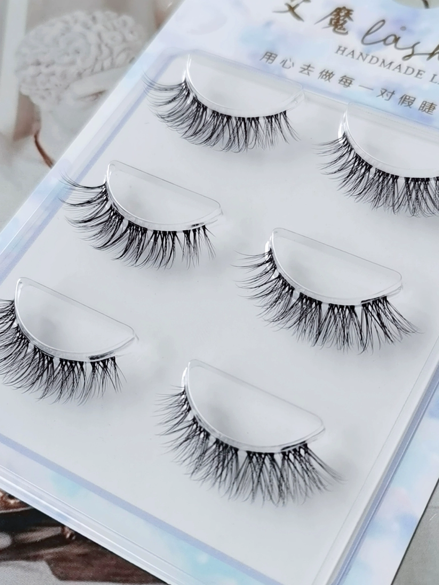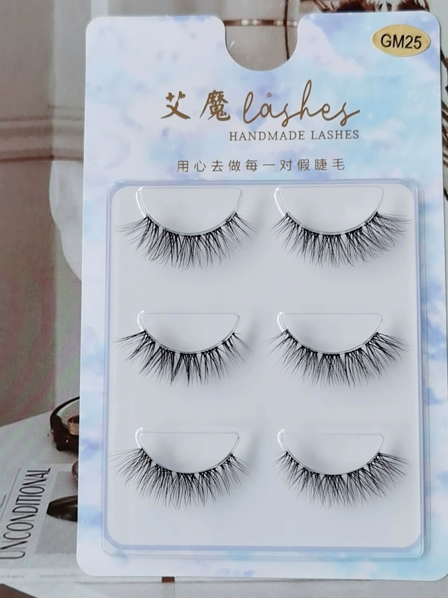 | nameOriginal | Ai Mo clustered segmented false eyelashes imitation mink hair light European and American eye makeup transparent stalk thick eye tail elongated GM25 |