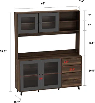 【Plenty of Storage Space】This large kitchen hutch offers ample storage space for all your kitchen essentials. The open surface is perfect for placing your cooking machines, such as a microwave, toaster, blender, or coffee maker. The shelves behind the glass doors are spacious enough to hold your tableware, dinnerware, glassware, or anything else you need.