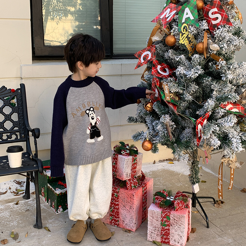 | nameOriginal | Aimo Beibei children's thickened Roland velvet contrast color sweater 2023 Winter baby warm cartoon embroidered New Year sweater |