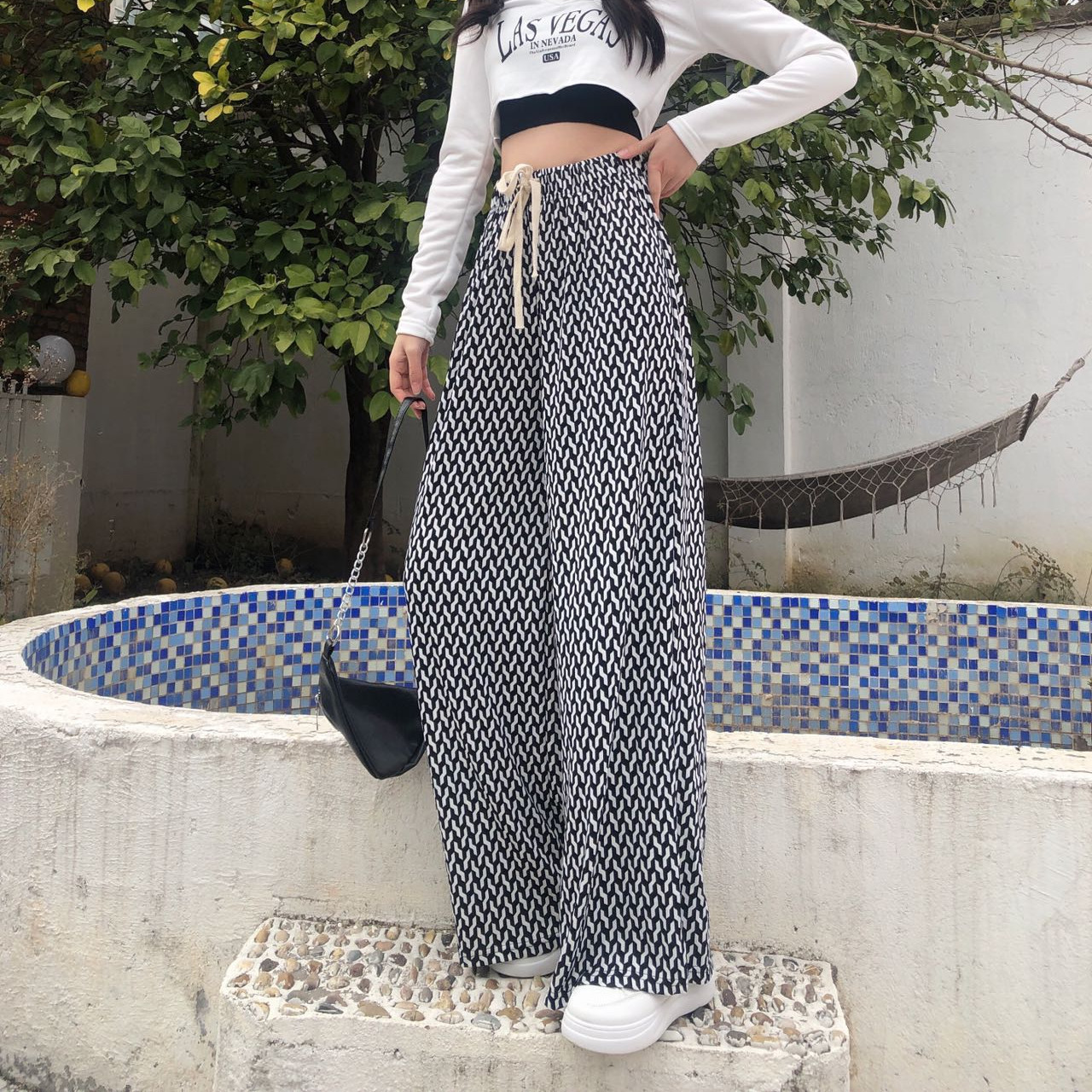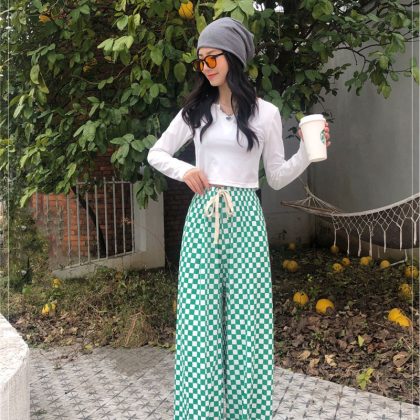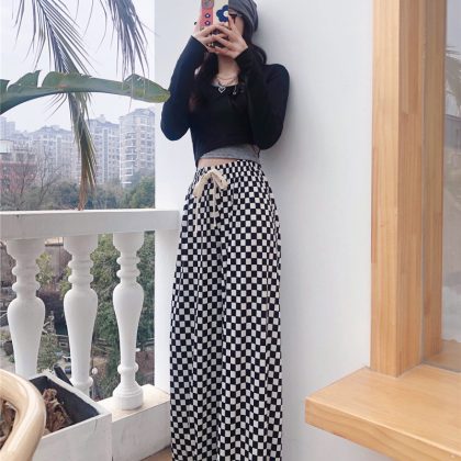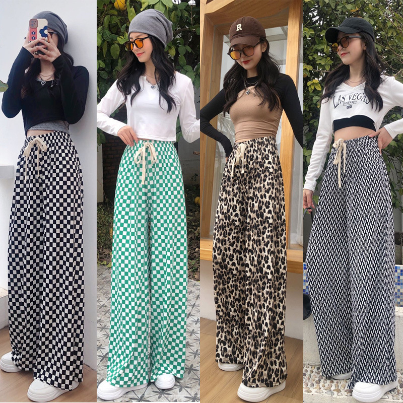 | nameOriginal | Air conditioning cool pants women's summer high waist drawstring ice silk pants thin printed mop straight pants chessboard Plaid wide leg pants |