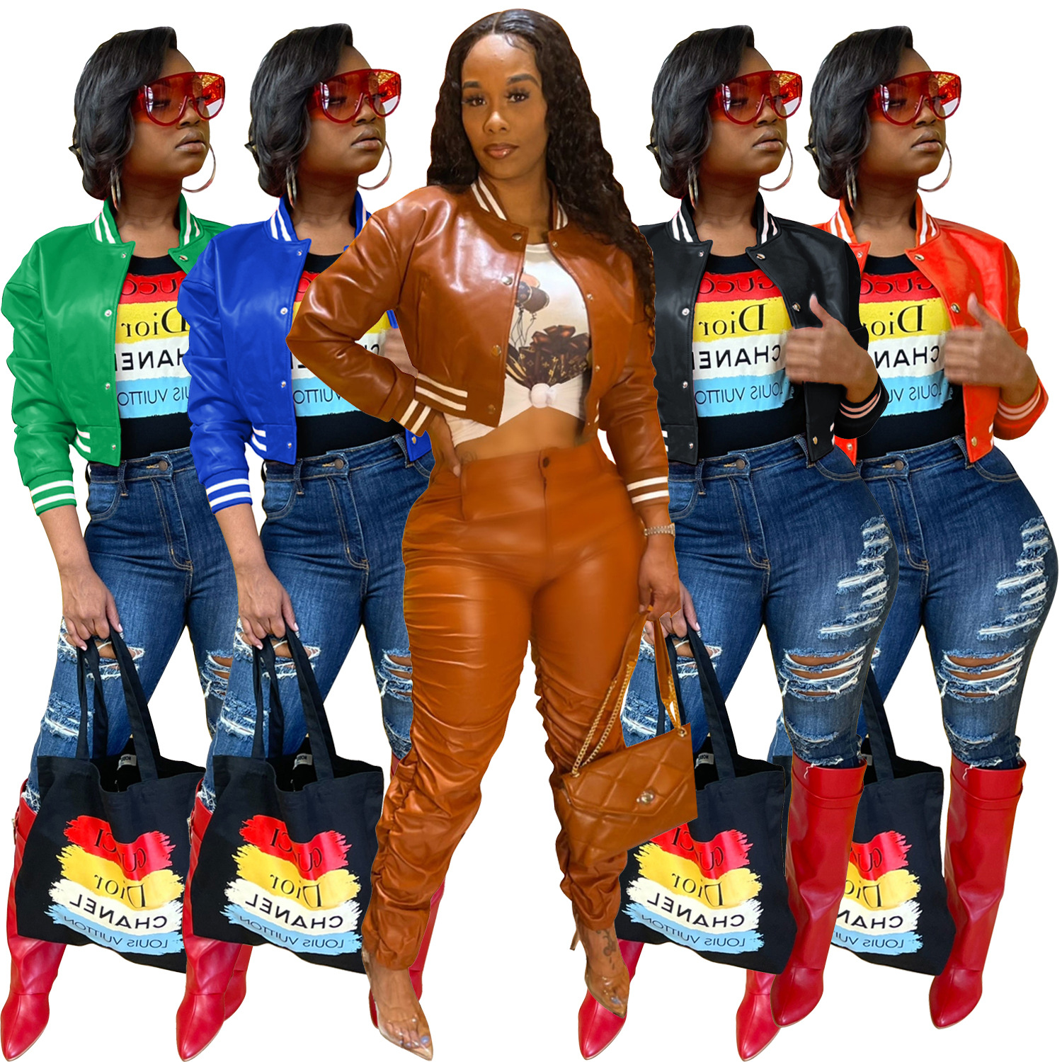 AL226 Amazon Independent Station European and American Women's PU Leather Jacket Imitation Leather Baseball Suit Coat Long Sleeve Autumn and Winter