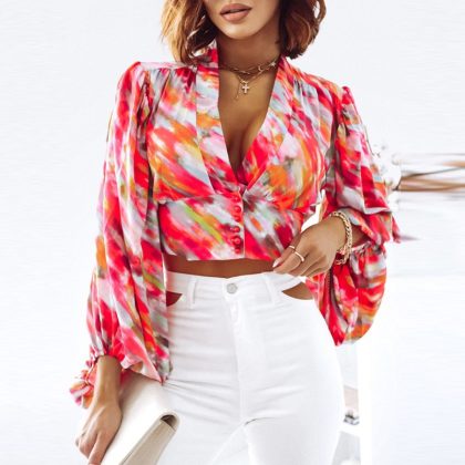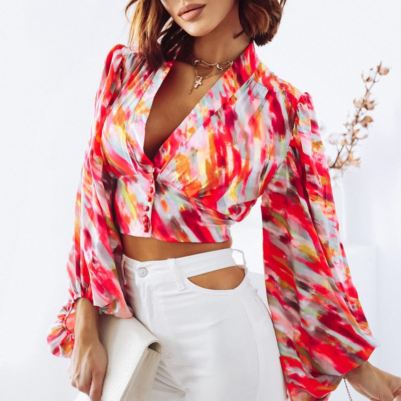 | nameOriginal | AliExpress Amazon 2023 Summer Fashion Sexy V-neck Shirt Breasted Tight Waist Printed Lantern Sleeve Shirt Women |