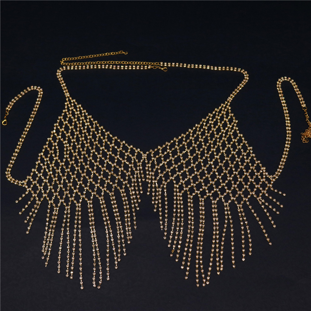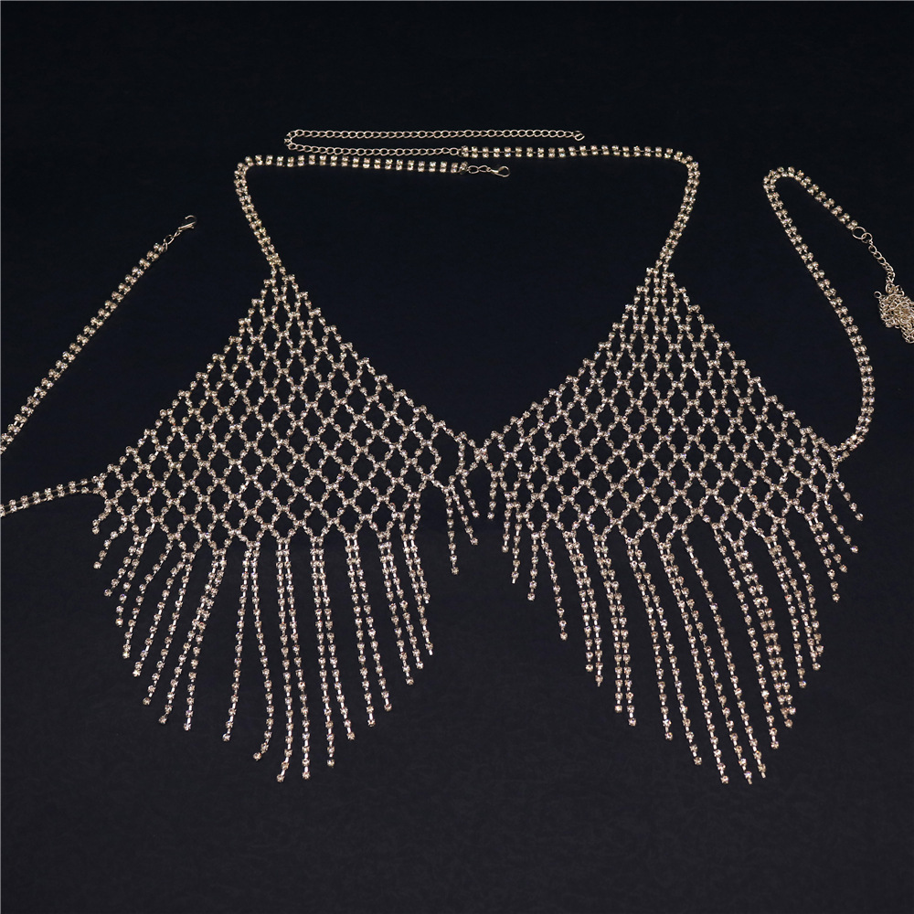 | nameOriginal | AliExpress Explosions Accessories European and American Nightclubs Shiny Tassel Chest chain Grid Rhinestone body chain |