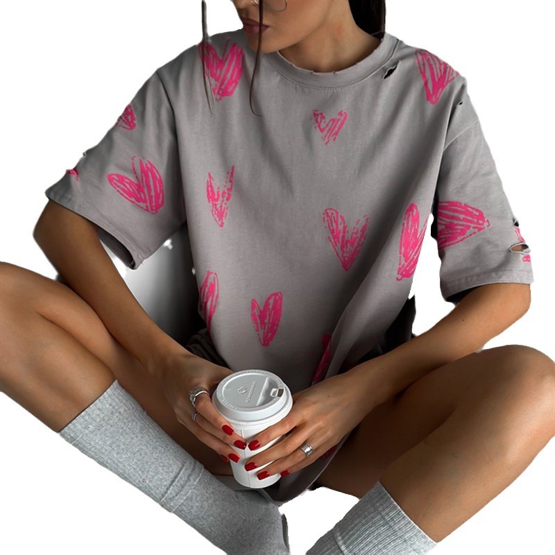 | nameOriginal | AliExpress popular round neck shoulder heart-shaped printed ripped design washed short sleeve T-shirt loose fashion brand top |