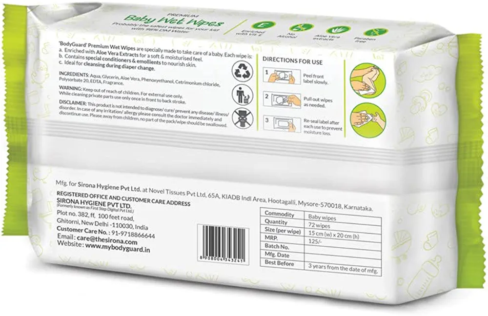 | nameOriginal | Bodyguard Baby Wet Wipes With Aloe Vera – 72 Wipes, Piece Of 1 |