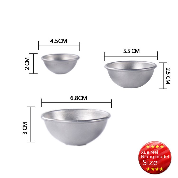 | nameOriginal | Aluminum alloy bath salt ball mold snow Mei Niang shallow semicircular mold handmade soap mold jelly pudding mold 1#2#3# |