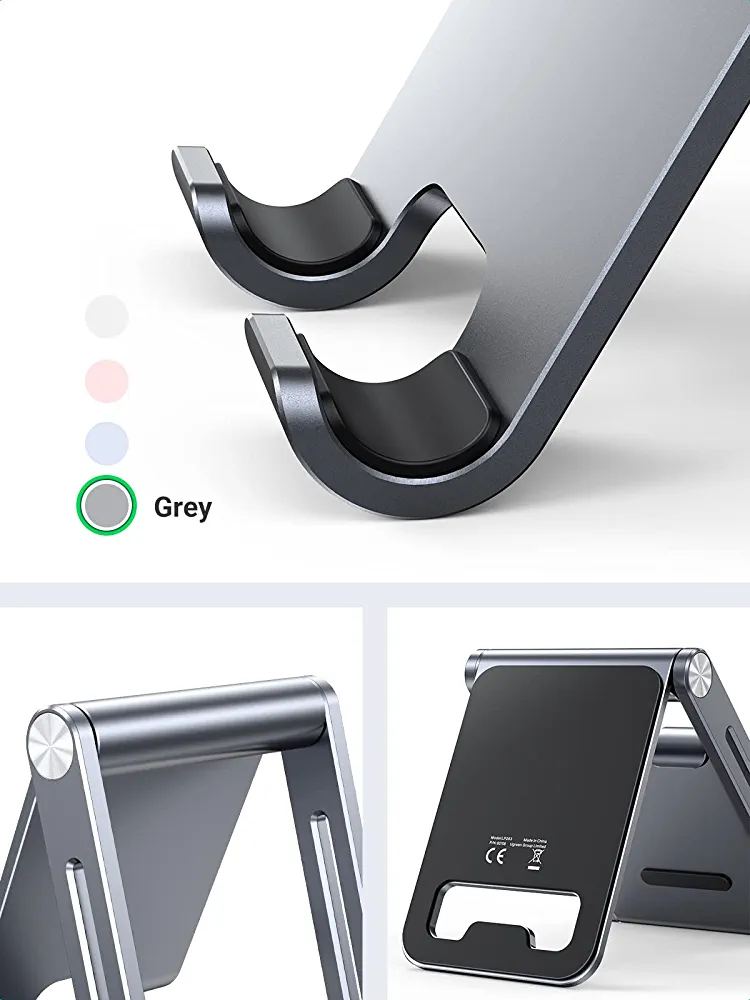 Aluminum phone stand with adjustable height and foldable design. Compatible with all mobile phones, including iPhone 14 Pro/14 Pro Max, Samsung Galaxy, and iPad. Available in grey.