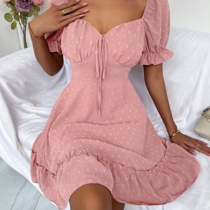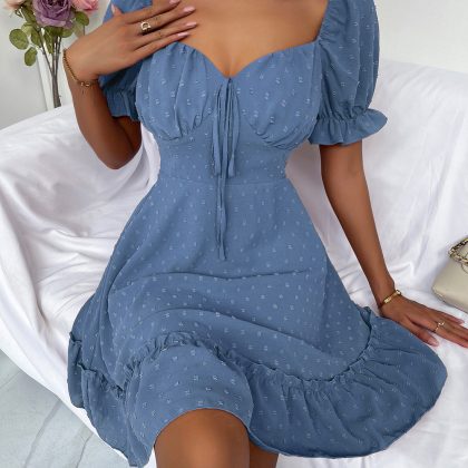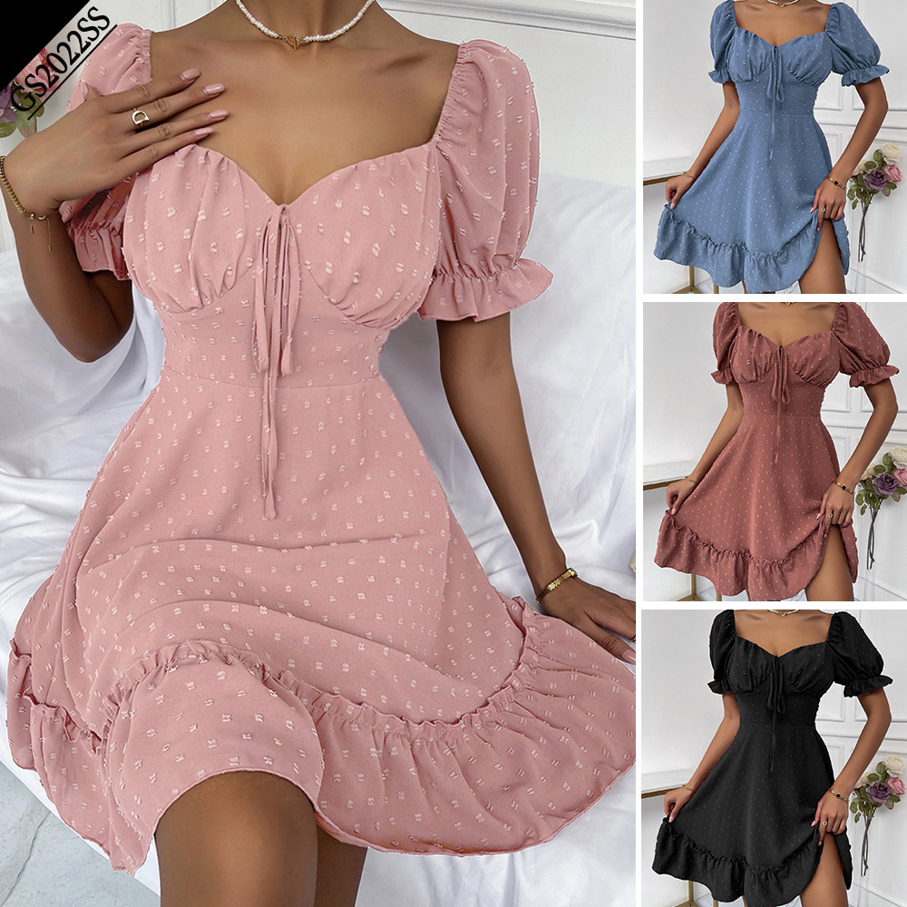 | nameOriginal | Amazon 2022 summer new women's pullover square collar skirt solid color polka dot ruffled commuter short sleeve dress |