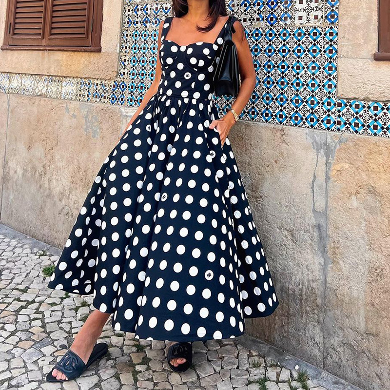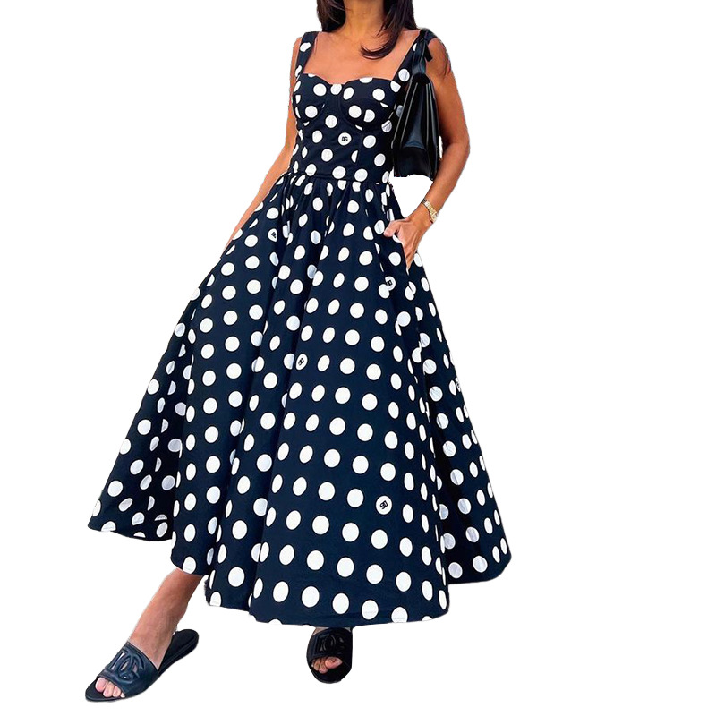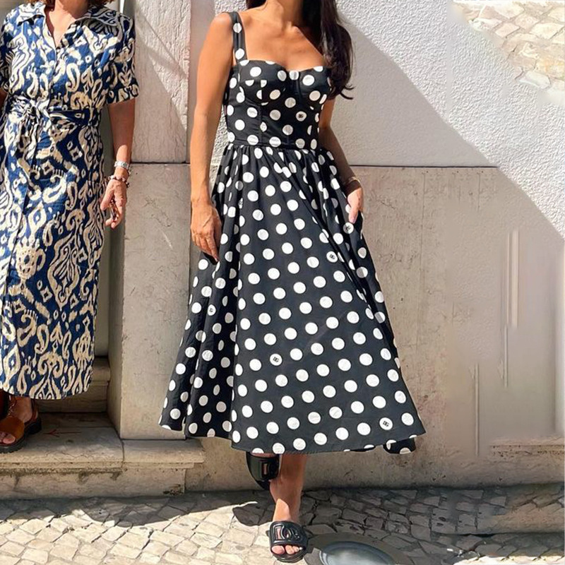 | nameOriginal | Amazon 2024 Spring and Summer New Women's Wave Dot Sling Slim-fit Slimming High Waist Sexy Large Swing Mid-length dress |