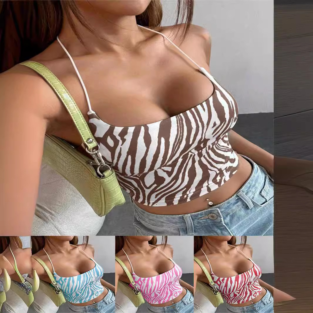 Amazon 2024 Summer New Women's Zebra Stripe Printed Back Lace Short Camisole Top