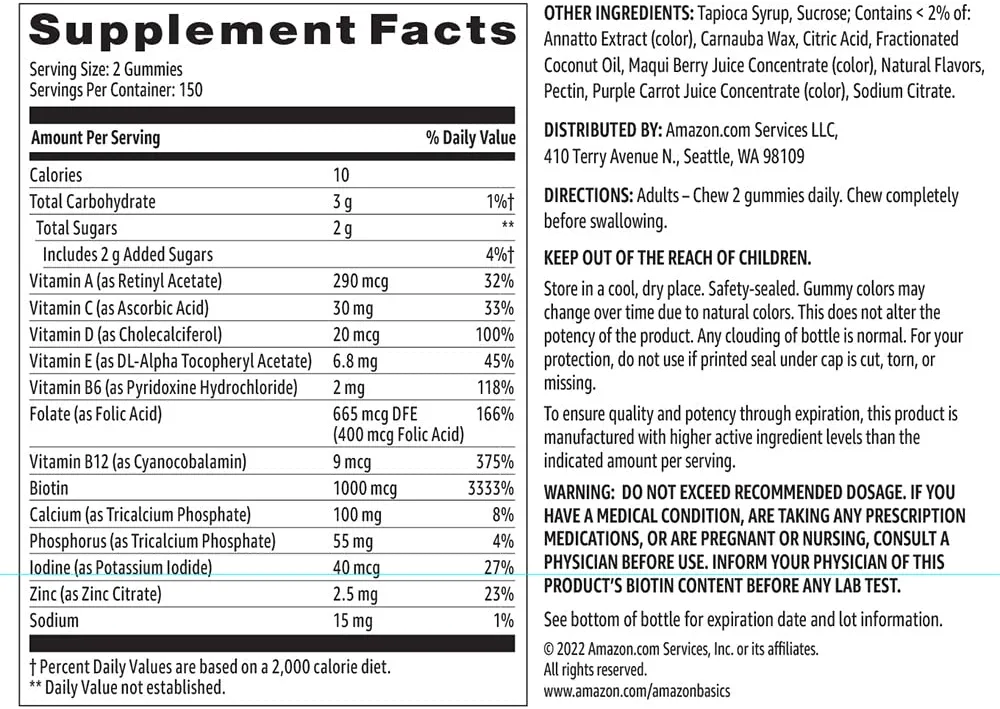 | nameOriginal | Amazon Basics Women's Multivitamin, 300 Gummies (150 Servings) (Previously Solimo) |