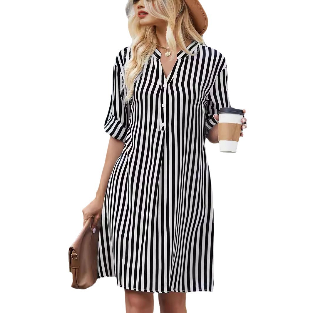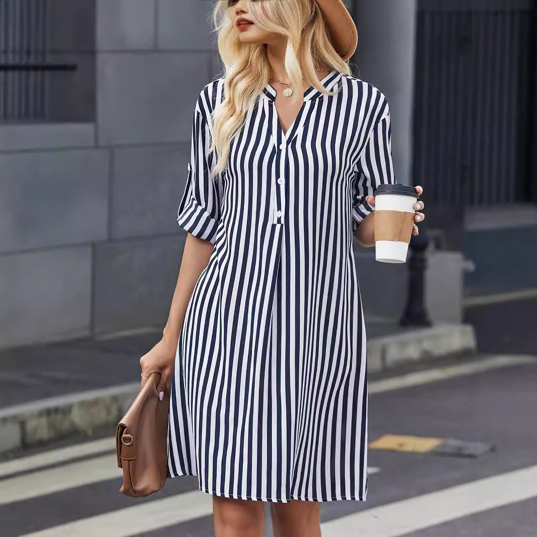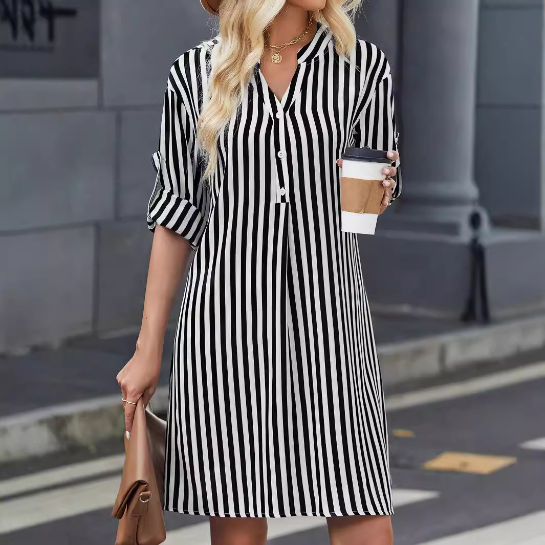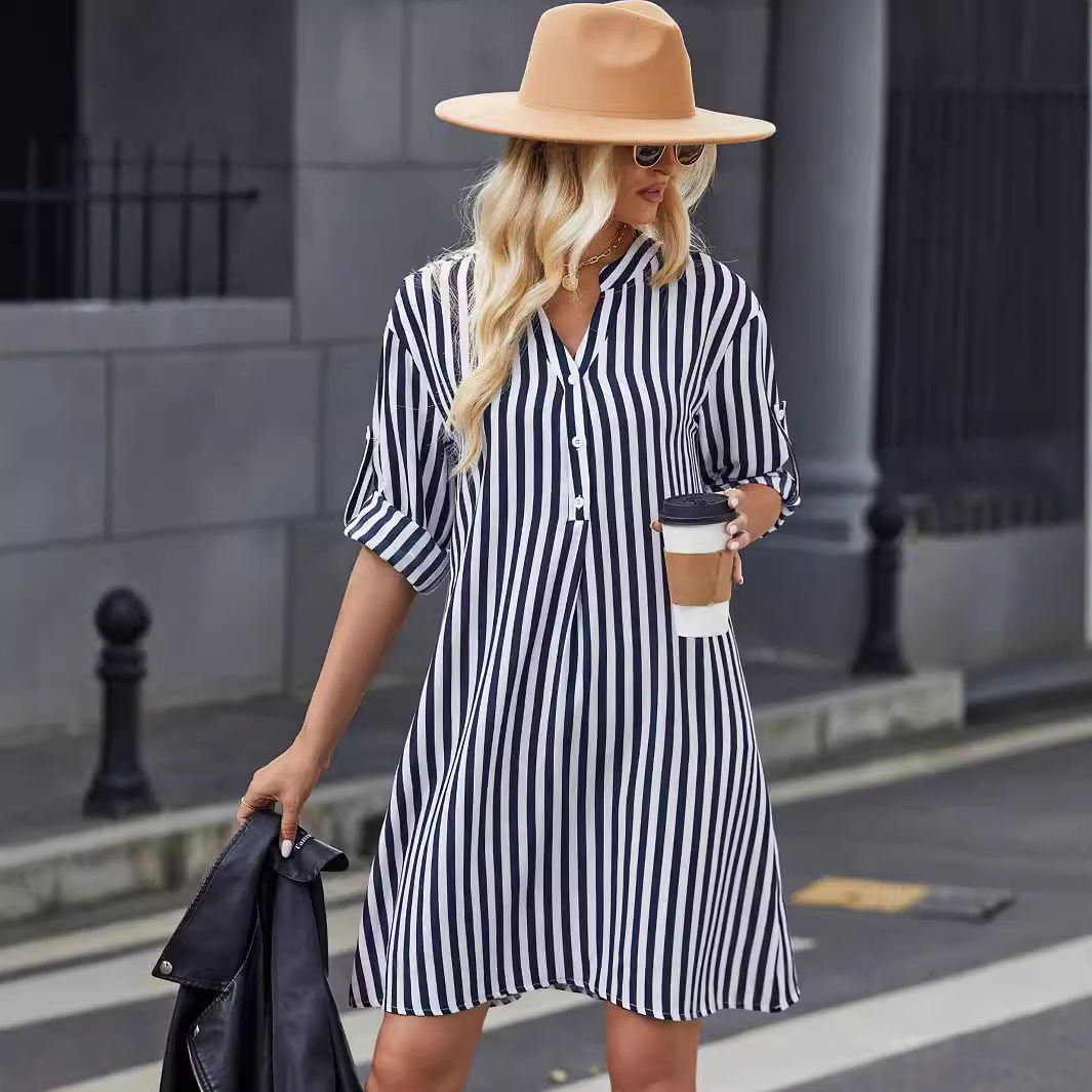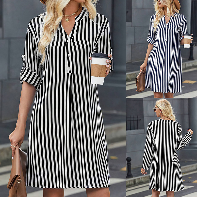 | nameOriginal | Amazon cross-border foreign trade European and American women's clothing 2024 autumn striped long sleeve dress fashion button V-neck shirt |