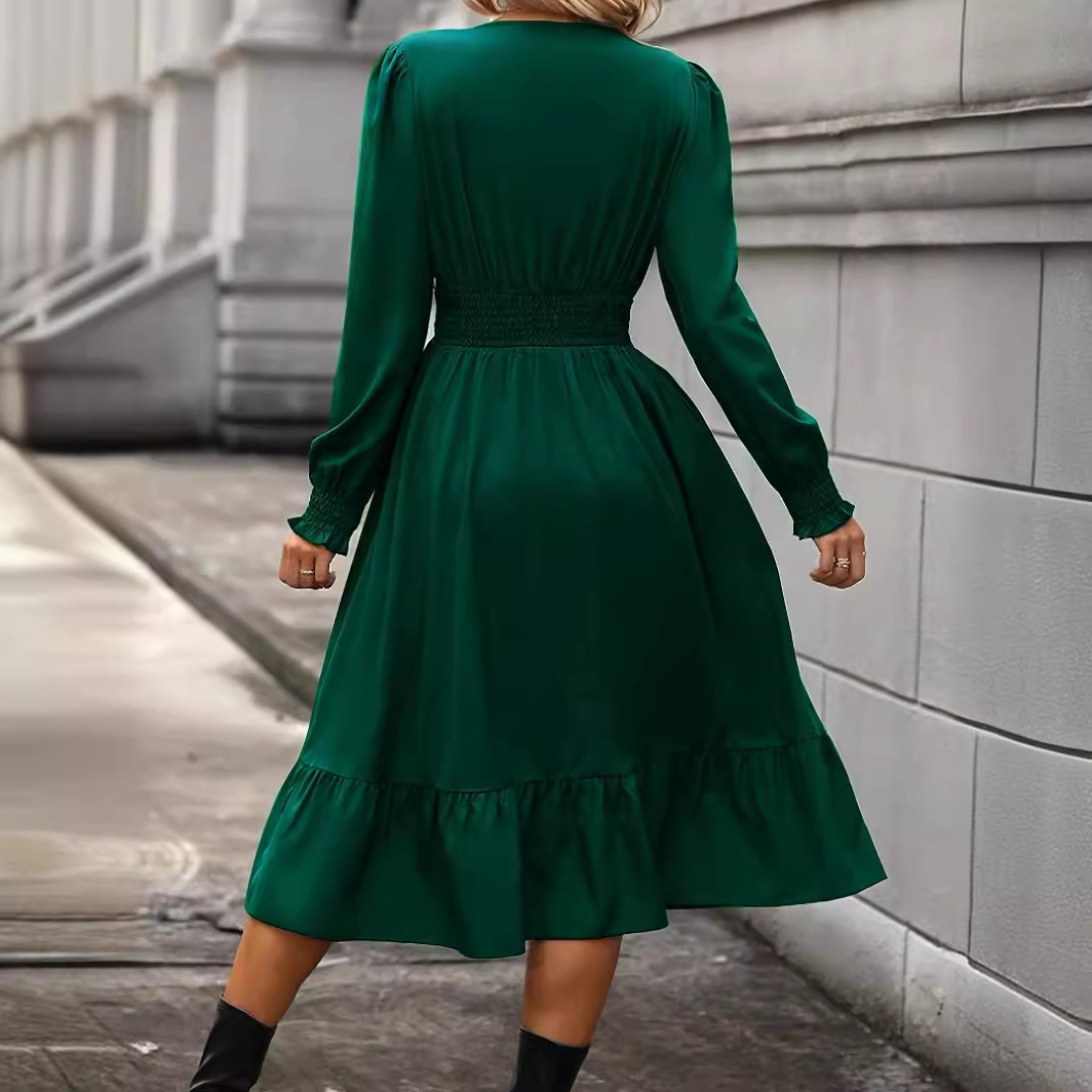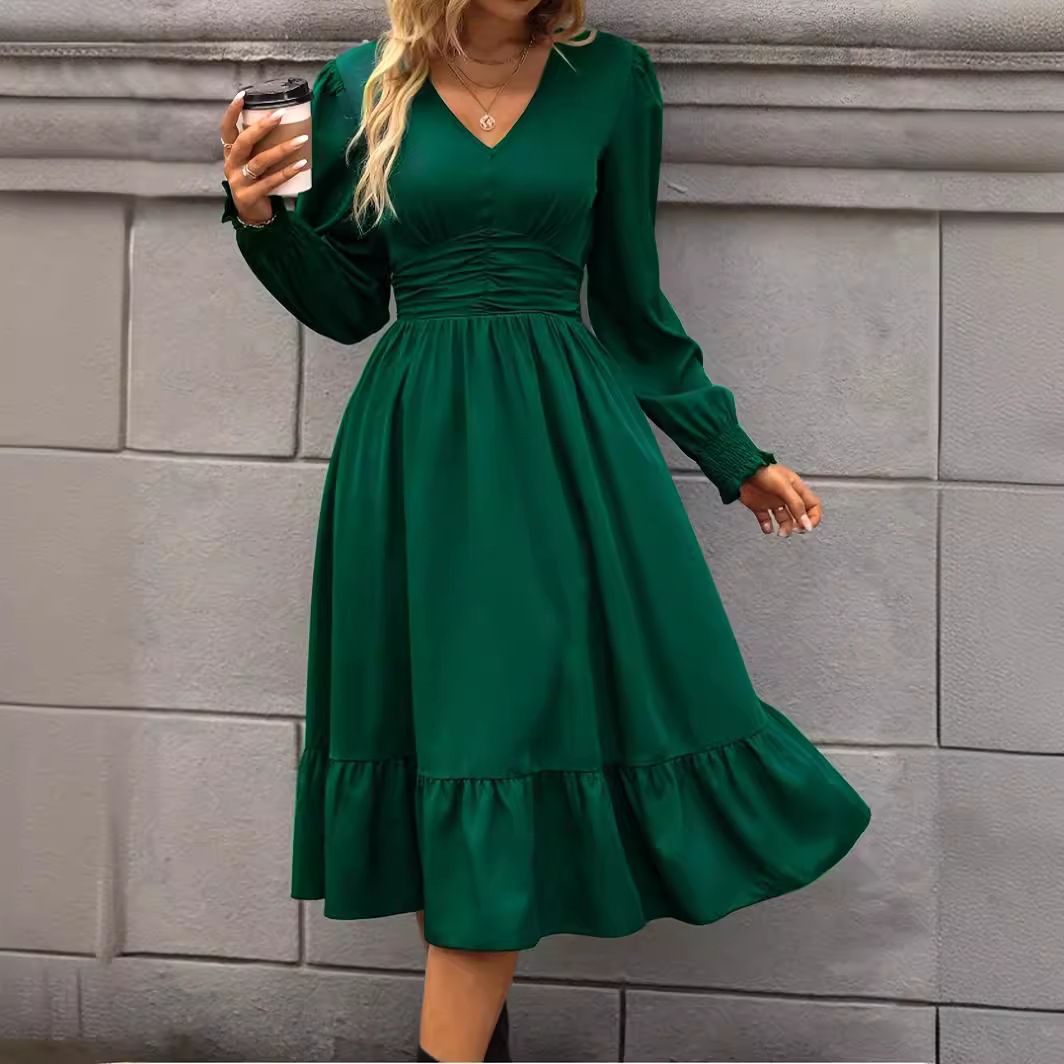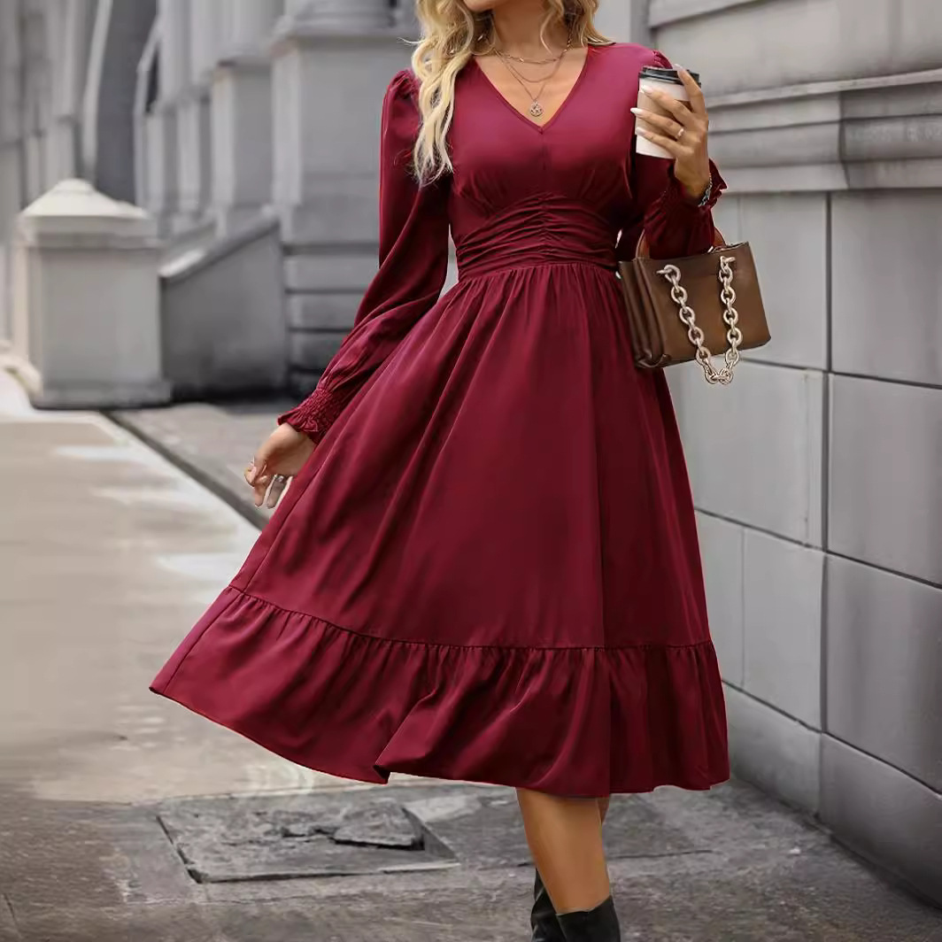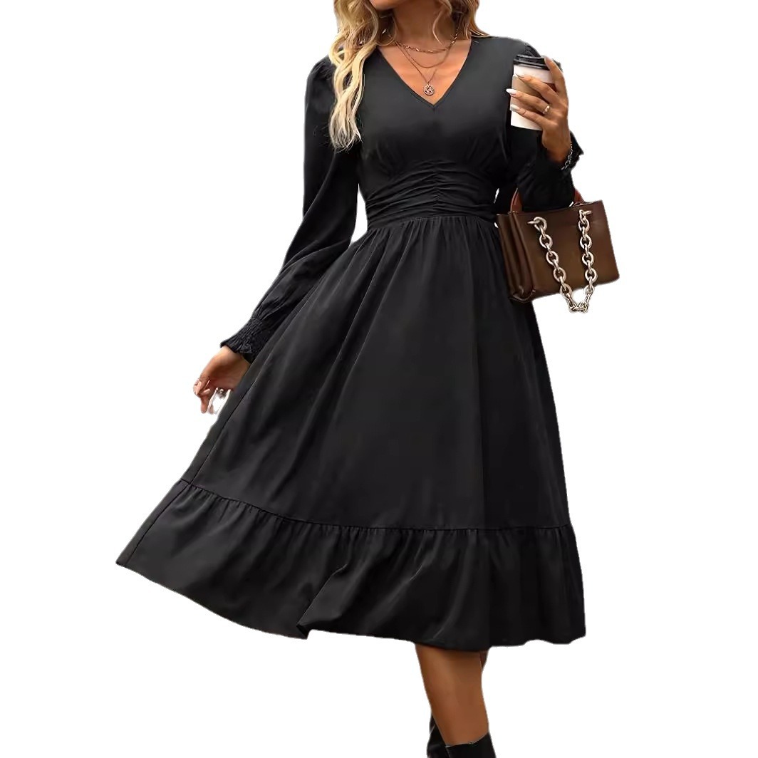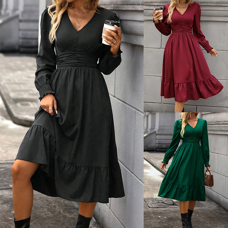| nameOriginal | Amazon cross-border foreign trade European and American women's clothing 2024 spring and autumn fashion V-neck long sleeve waist solid color large swing dress |