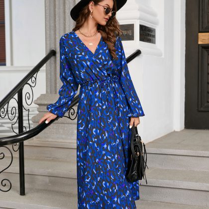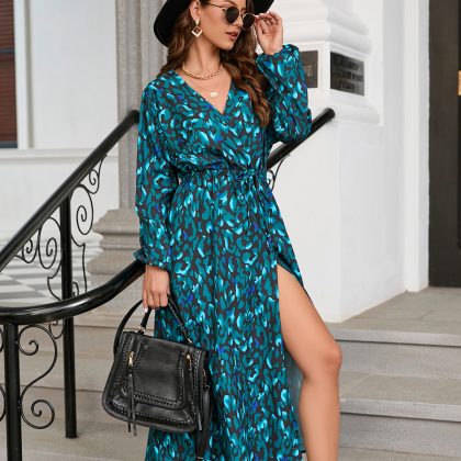 Amazon cross-border supply Europe and the United States foreign trade Women’s European station autumn and winter leopard print split waist long sleeve dress