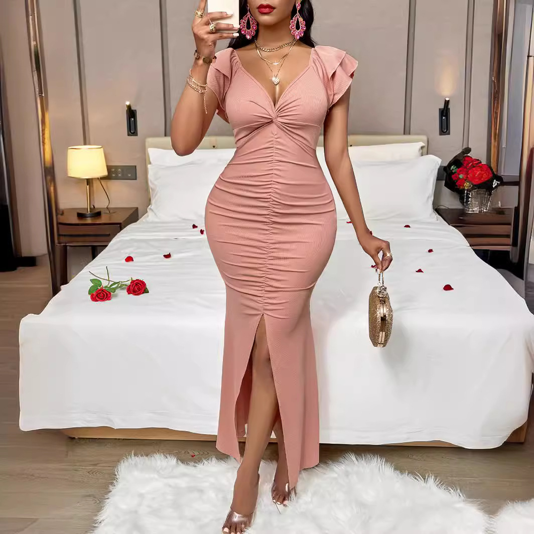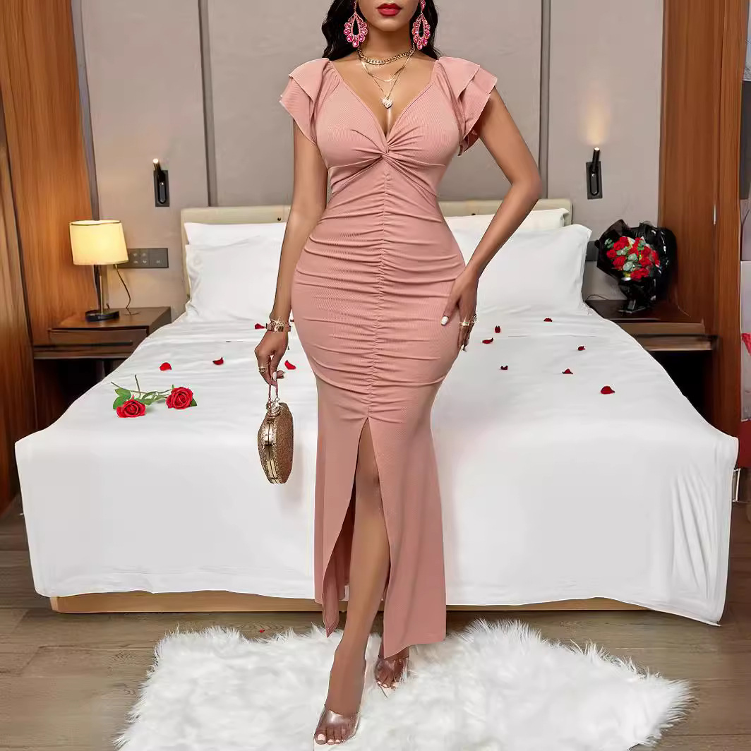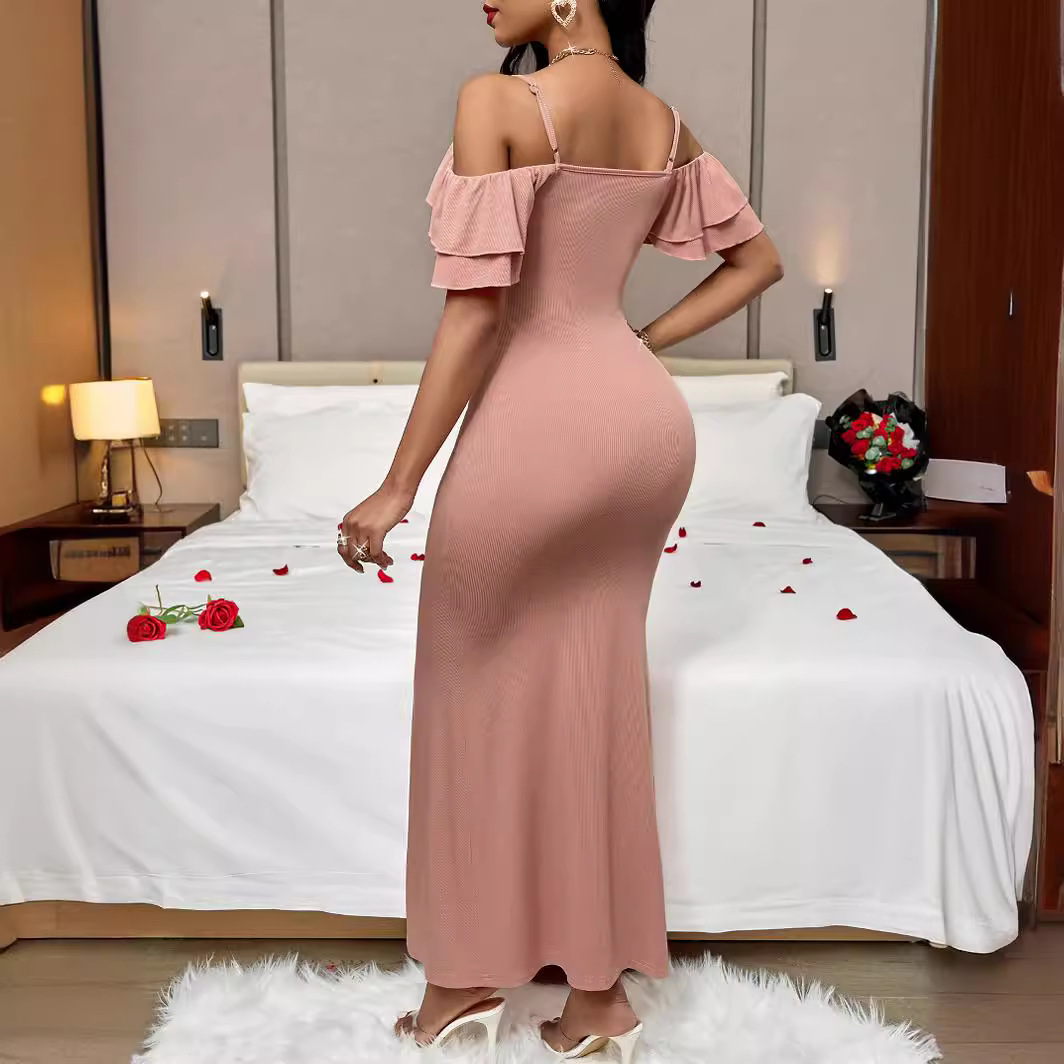 | nameOriginal | Amazon eBay summer European and American hot selling women's clothing solid color sexy style V-neck drop shoulder ruffled sling dress |