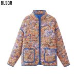 Amazon European and American cross-border women’s clothing printing color matching large pocket stand collar quilted cotton-padded coat women’s D15770
