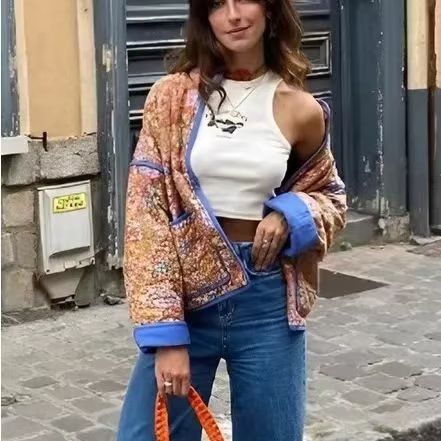 Amazon European and American cross-border women's clothing printing color matching large pocket stand collar quilted cotton-padded coat women's D15770