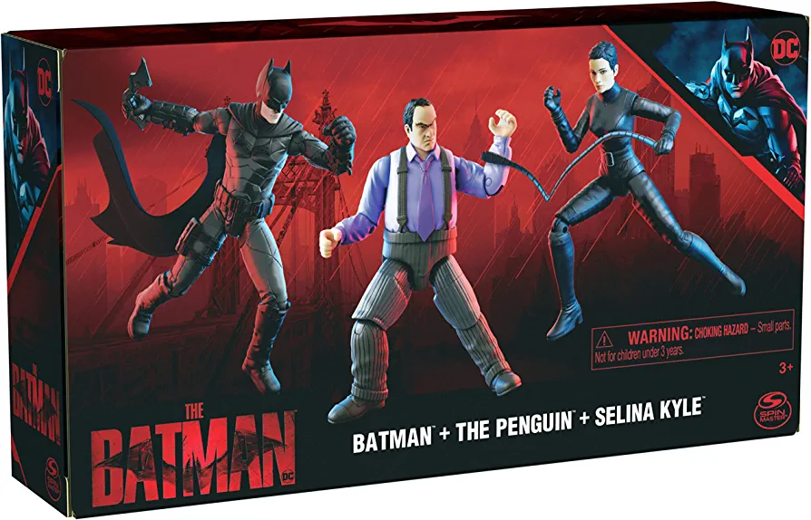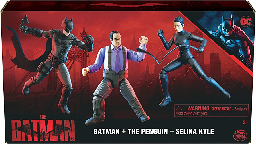 The Batman 3-Pack, exclusively available on Amazon, is a must-have for all Batman enthusiasts. This pack includes three 4-inch action figures of Batman, Selina Kyle, and The Penguin, along with three accessories to enhance your playtime experience. With this ultimate Batman action figures and playset, you can recreate your favorite scenes from the Batman movie or create your own epic storylines. Engage your imagination and prevent The Penguin from taking over Gotham City by using the exclusive Batman action figure. This toy is perfect for boys, girls, and anyone who loves Batman. Expand your Batman collection and bring your favorite movie moments to life with the Batman 3-Pack.