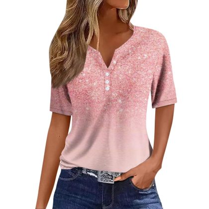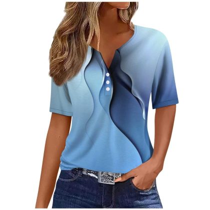 Amazon Explosions Women’s T-Shirt V-Neck Three-Button Printed Short Sleeve European and American Women’s Top Source Factory