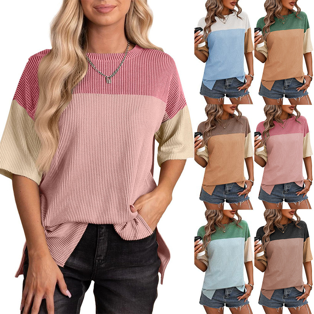 Amazon foreign trade Europe and the United States cross-border 2024 spring and summer new round neck twist strip color matching short sleeve loose T-shirt women