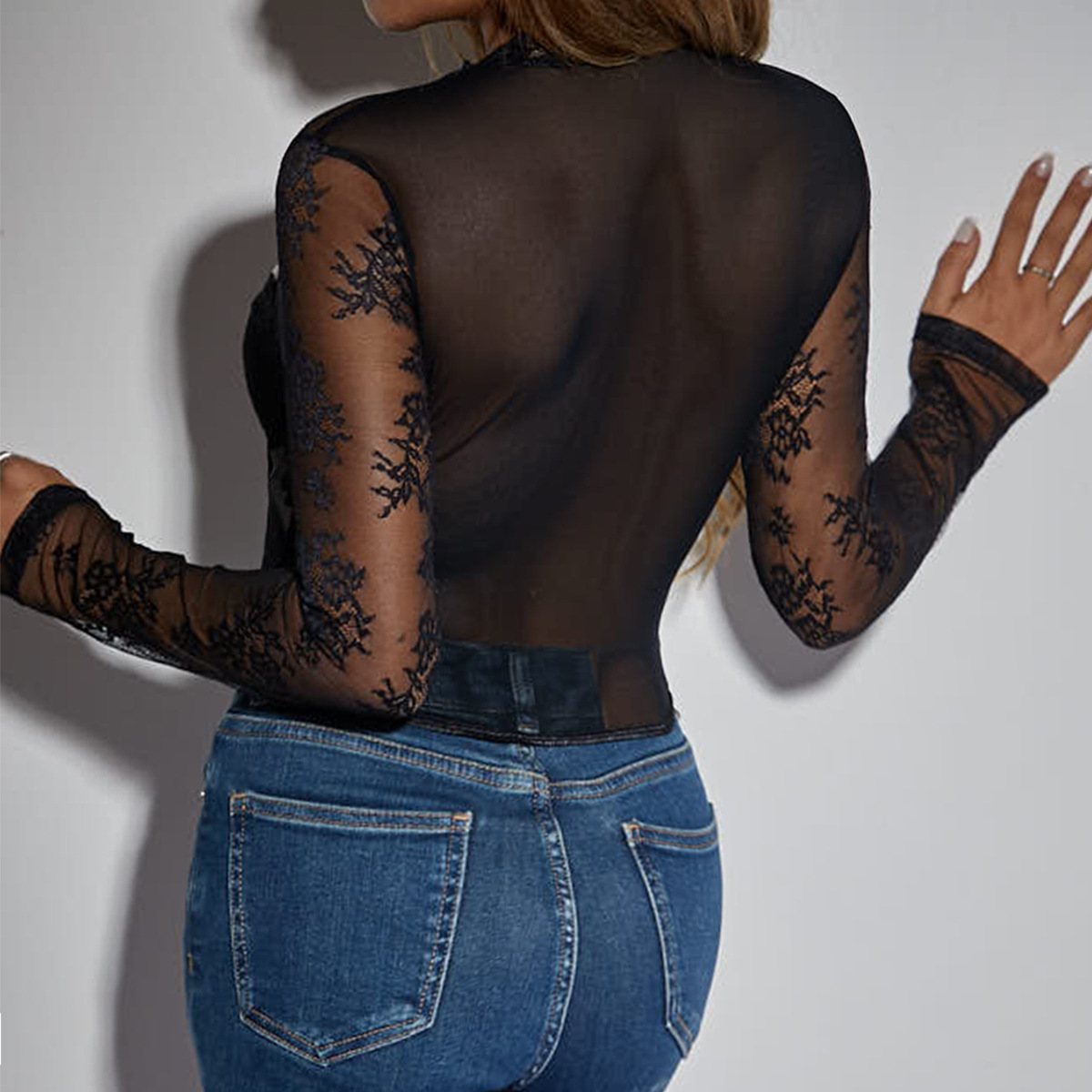 Amazon hot girl sexy flower lace hollow round neck long sleeve steel ring Fishbone perspective slim top A1299