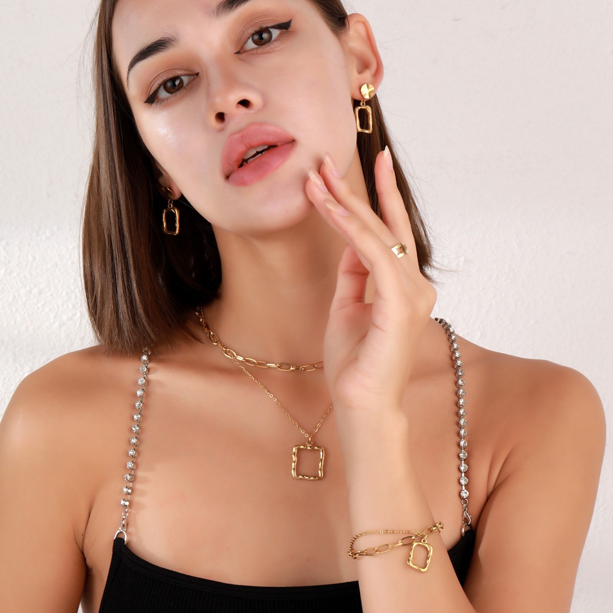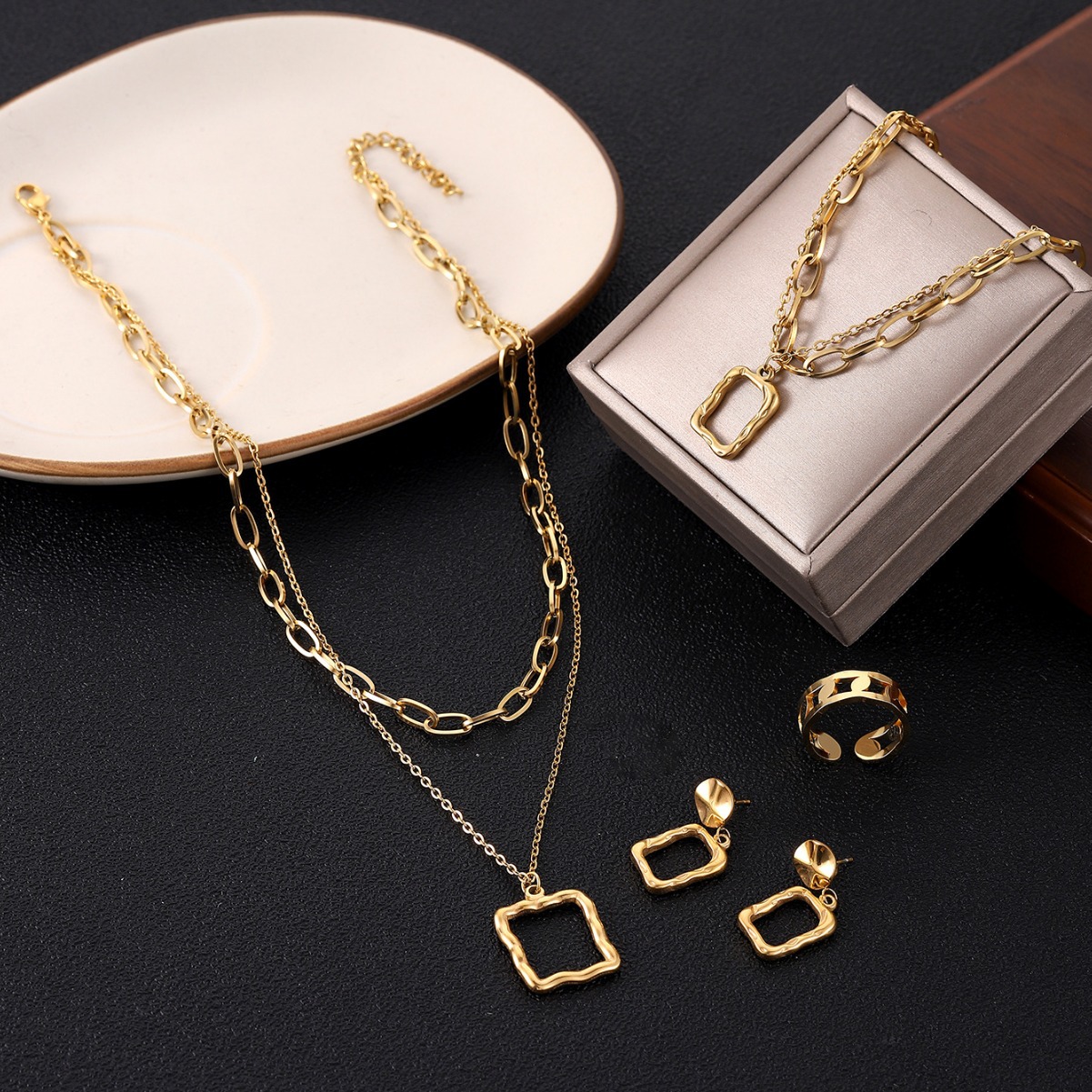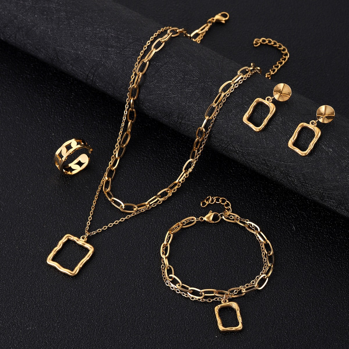 | nameOriginal | Amazon hot jewelry fashion OL double chain stacked necklace bracelet titanium steel gold earrings ring jewelry suit |