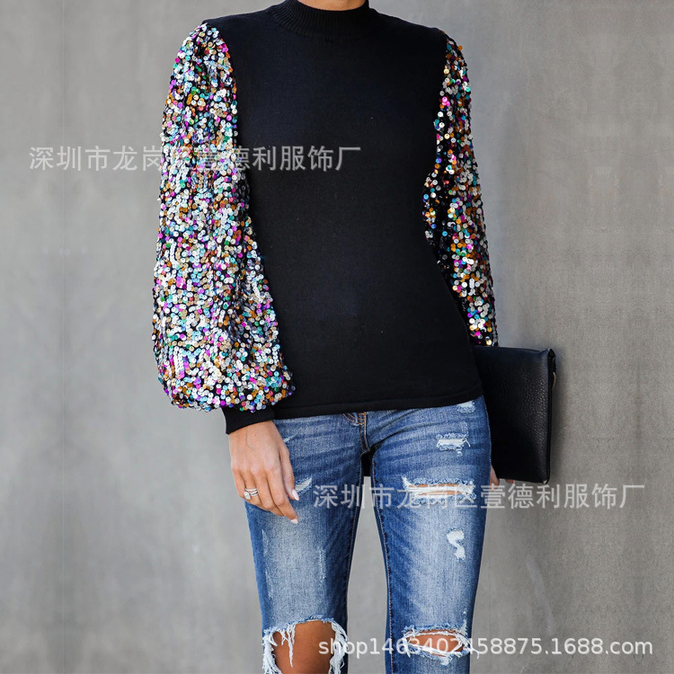 | nameOriginal | Amazon Hot Sale European and American Fashion Half High Collar Bead Piece Splicing Lantern Sleeve Long Sleeve Top Autumn and Winter New SU1911 |