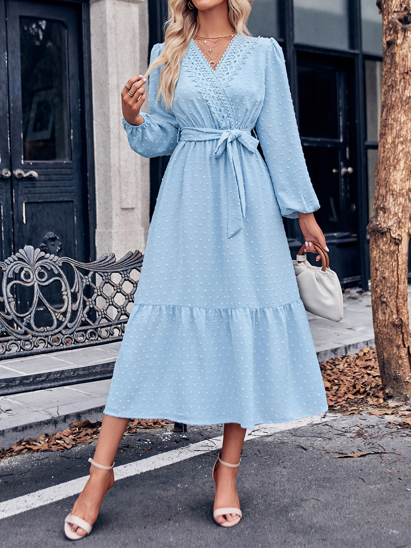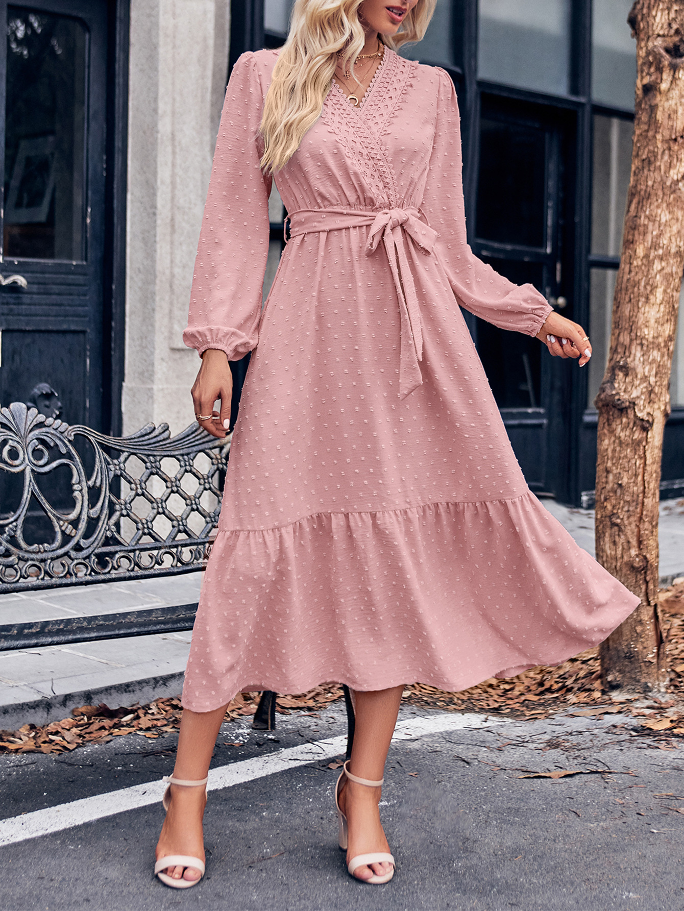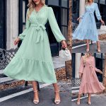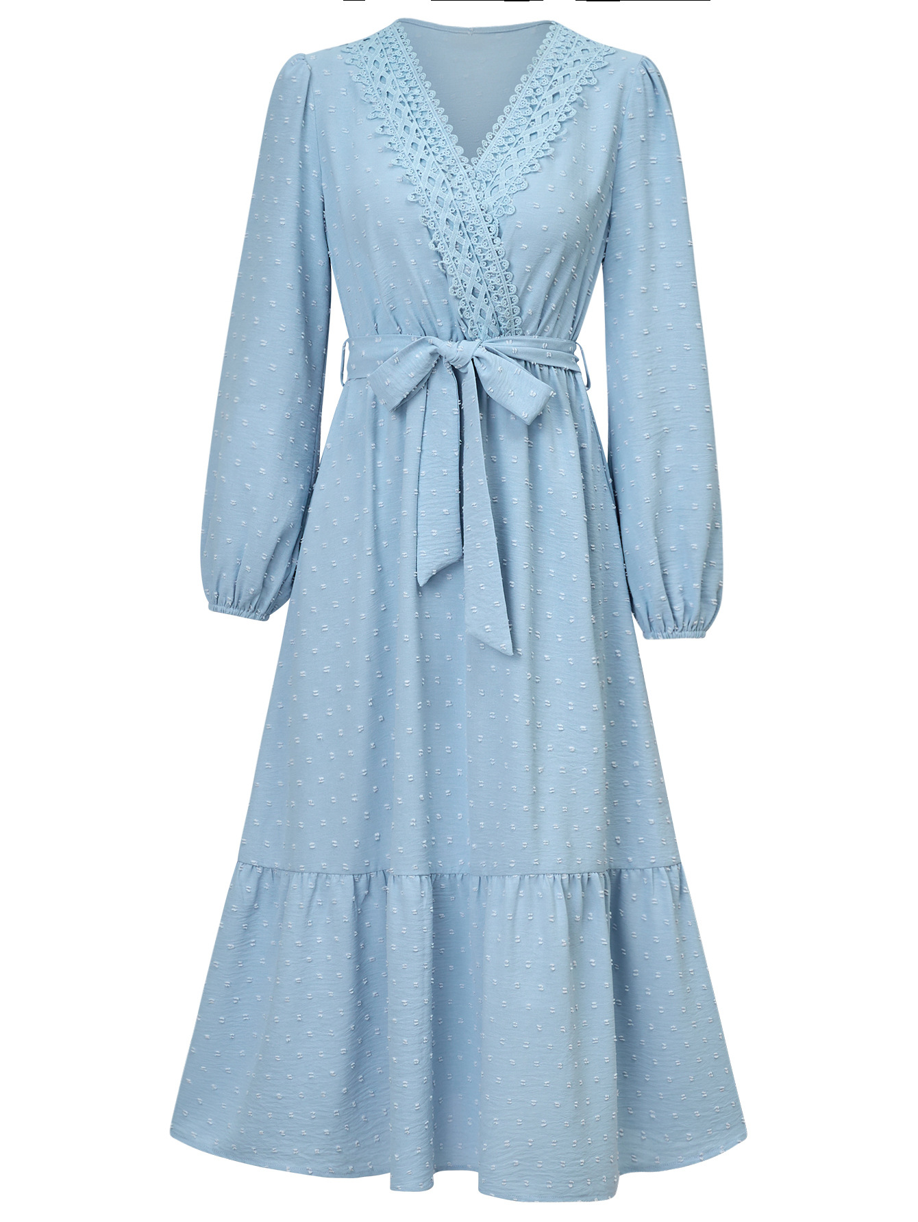 | nameOriginal | Amazon Independent Station European and American Women's Autumn and Winter 2024 New Fashion Solid Color V-neck Lace Tie Waist Dress |