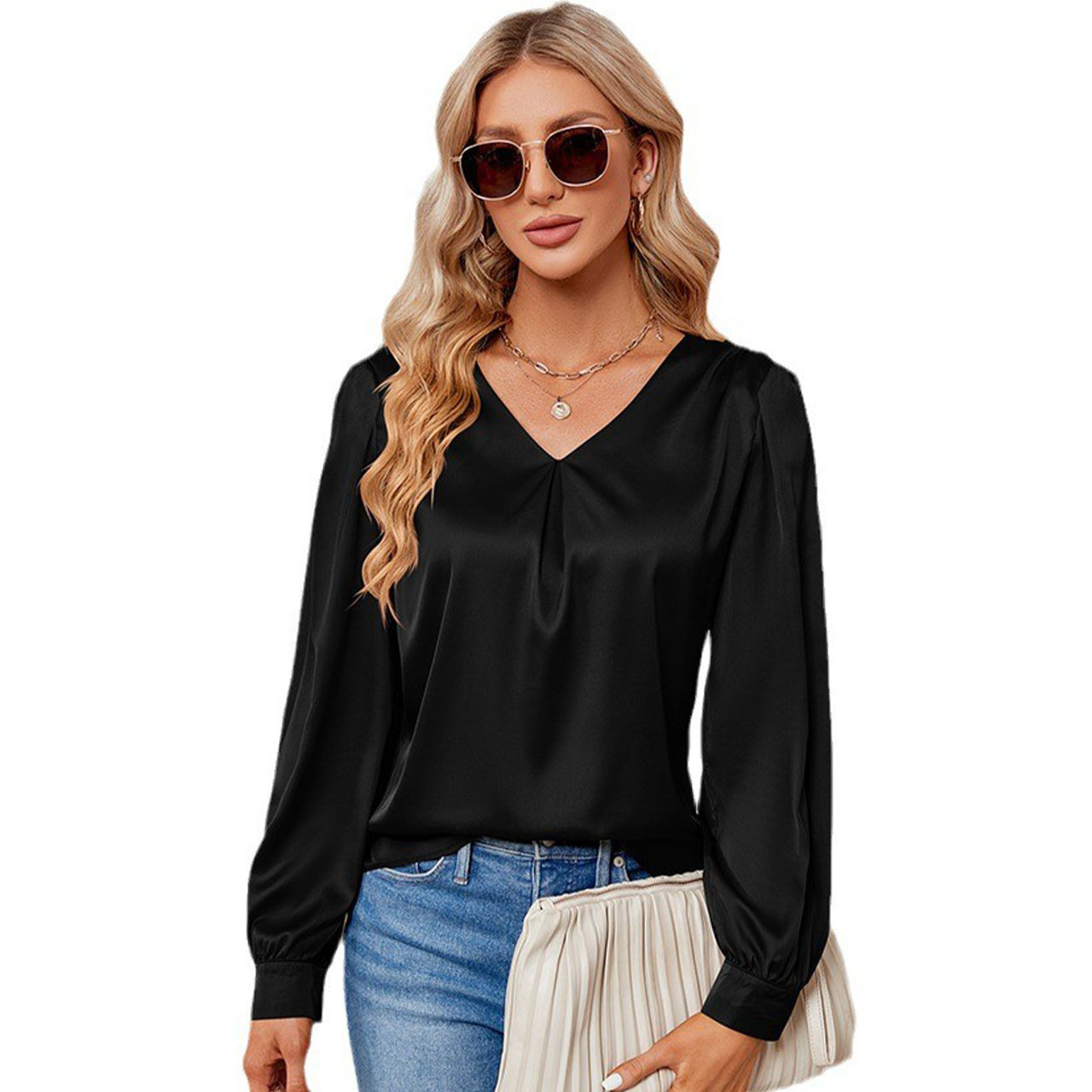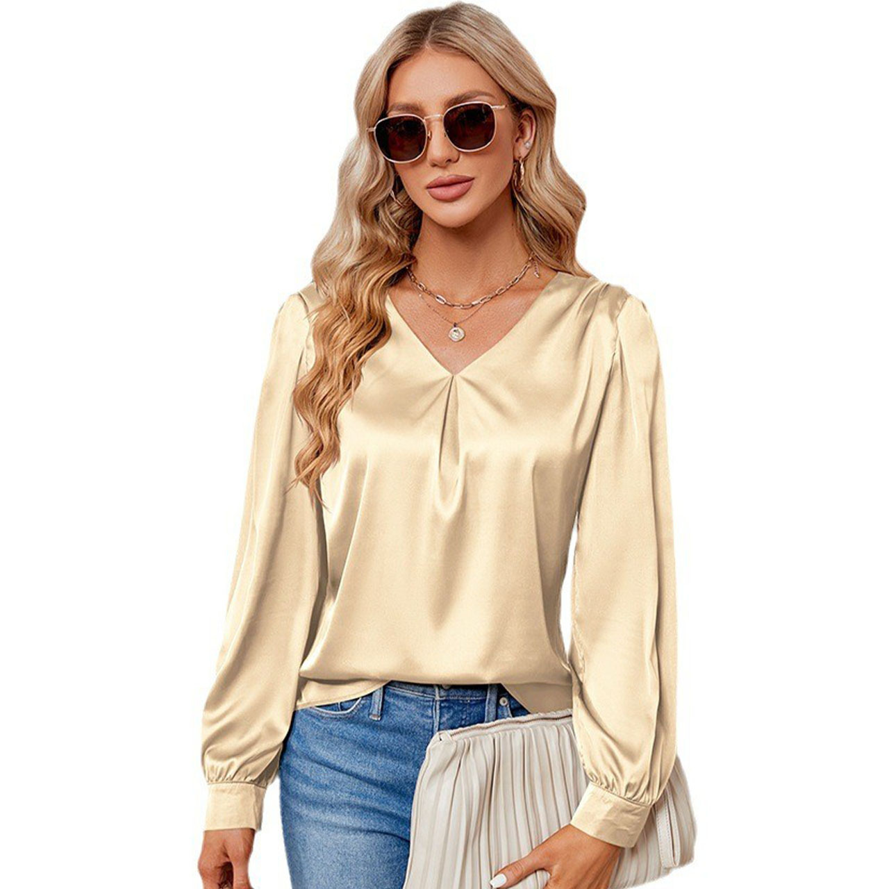 Amazon independent station women’s clothing 2023 new satin pleated long-sleeved shirt V-neck satin shirt