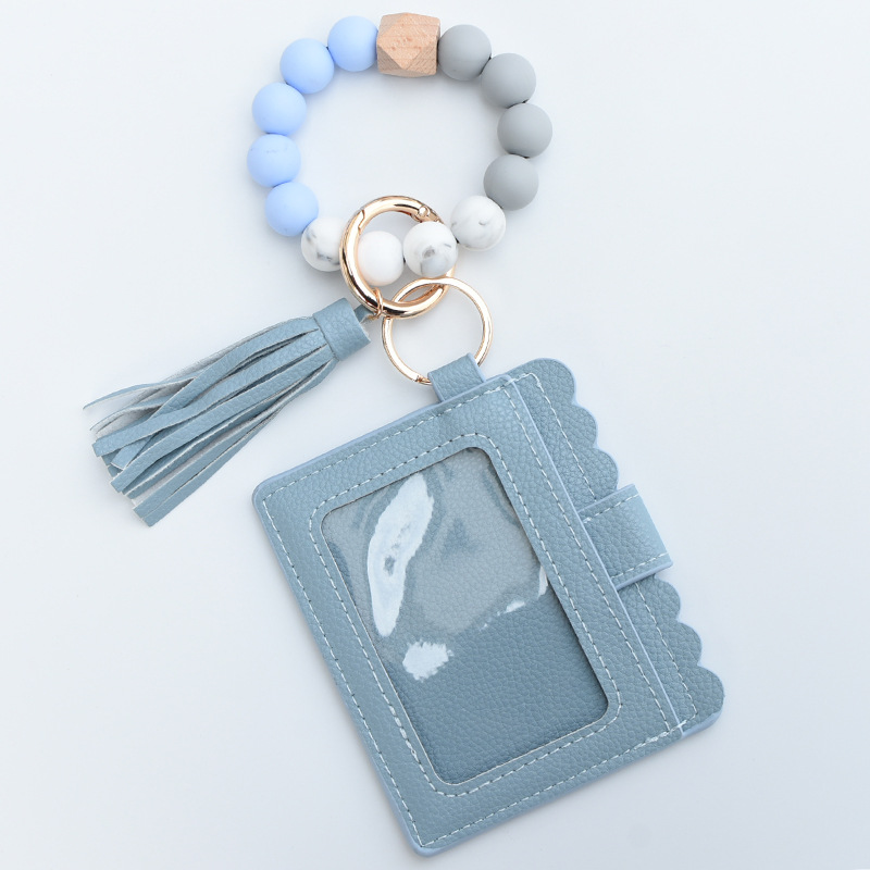 Amazon New Color Silicone Bead Bracelet Card Holder pu Tassel Women Wallet Beaded Bracelet Keychain