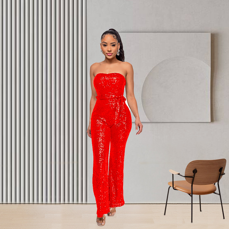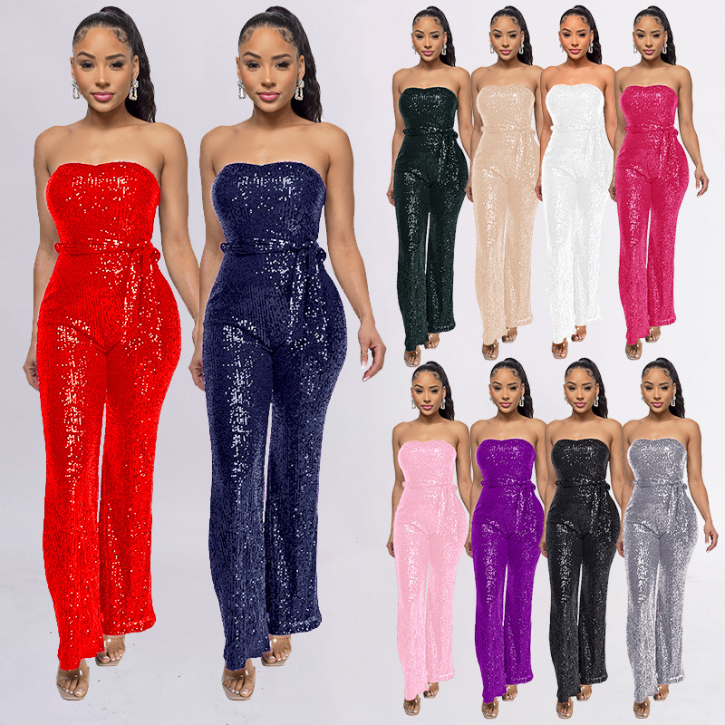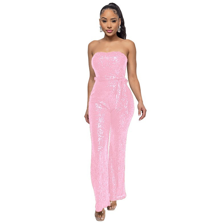 Amazon new women’s sleeveless tube top jumpsuit European and American INS style sequined backless belt jumpsuit wholesale