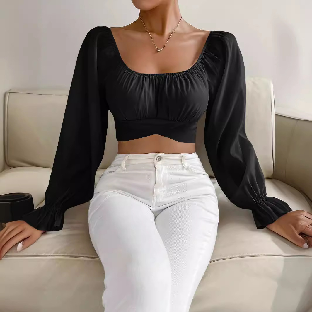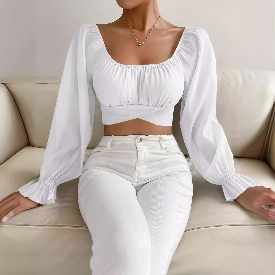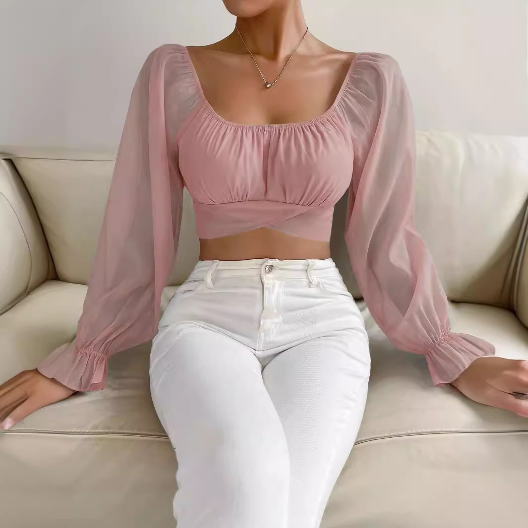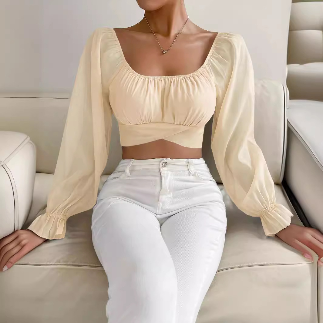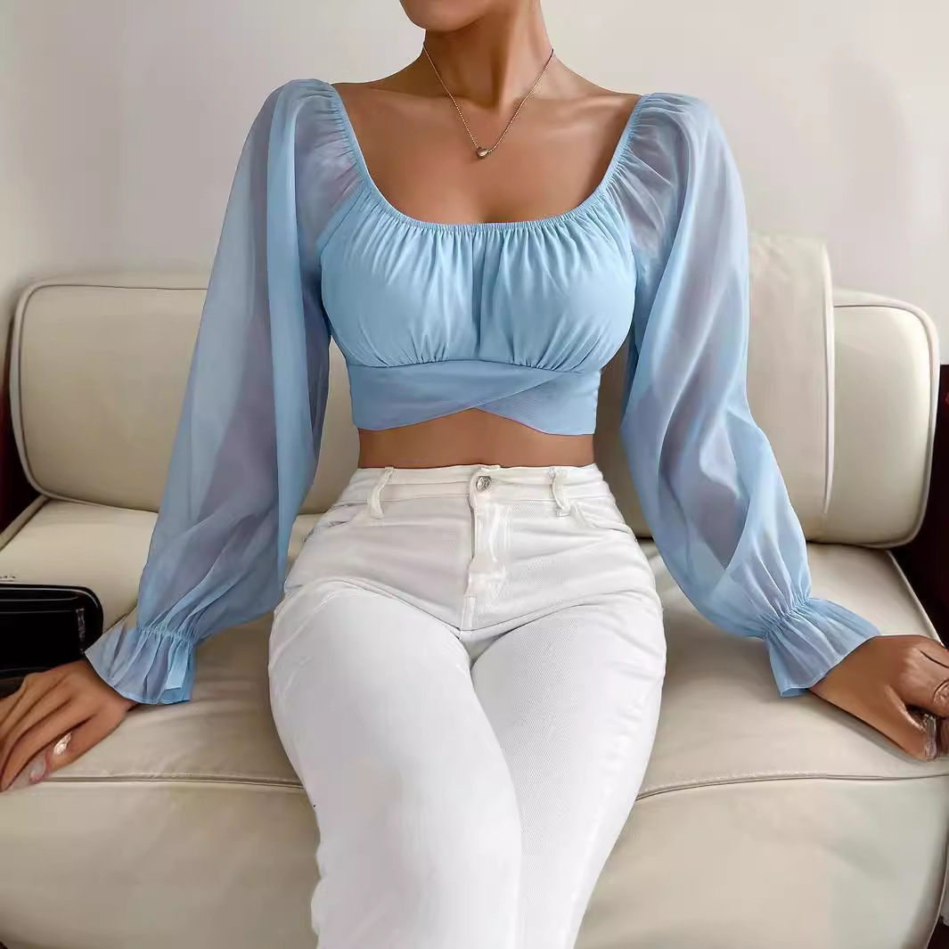 | nameOriginal | Amazon Women's Elegant Square Collar Long Sleeve Chiffon Perspective Sexy Backless Cross Strap Short Base Top |