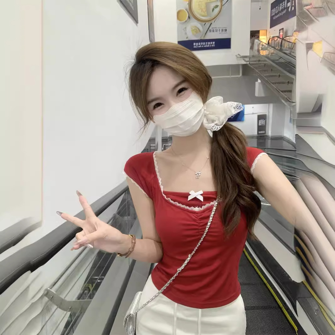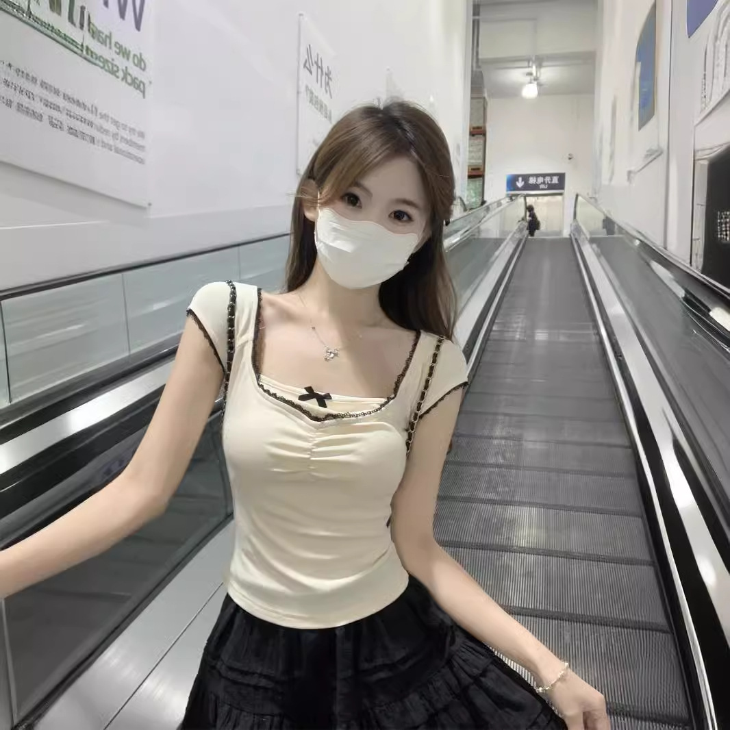 | nameOriginal | American 2024 Summer New Korean-style Slim-fit Ear Edge Contrast Color Bow Slimming All-match Short-sleeved T-shirt Top |