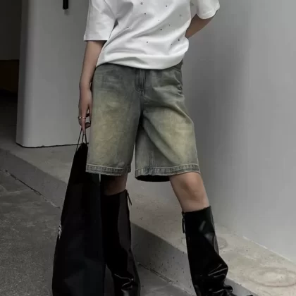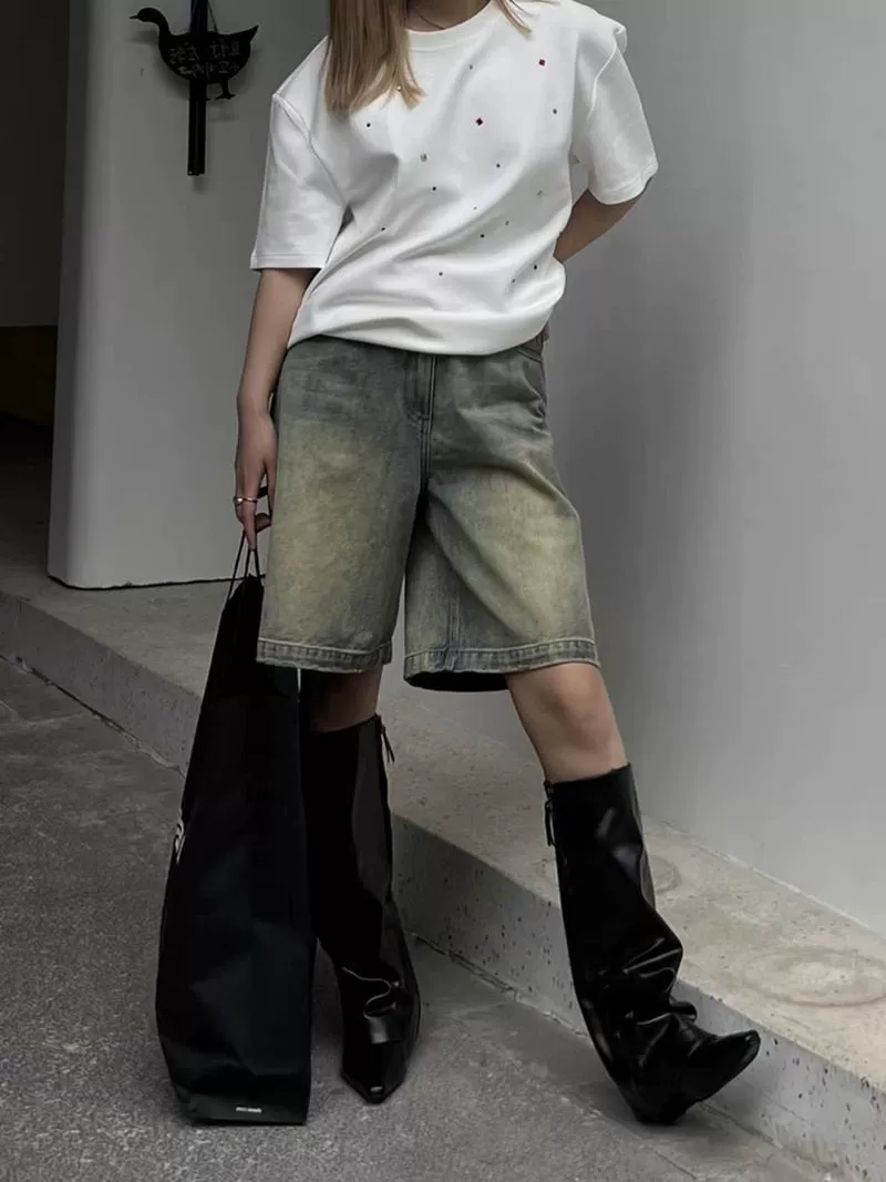 American distressed five-quarter fat mm slimming wide-leg jeans