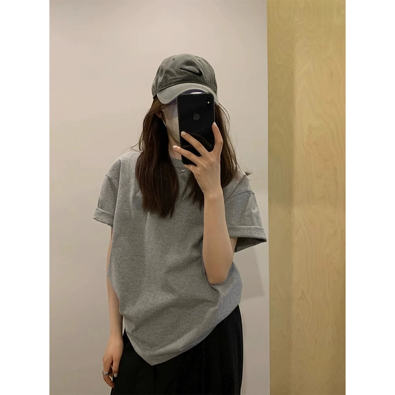| nameOriginal | American gray right shoulder short-sleeved t-shirt for women summer solid color heavy cotton t-shirt loose slimming half-sleeved top |