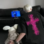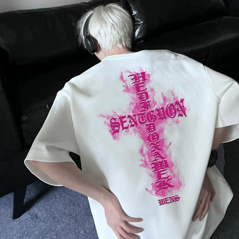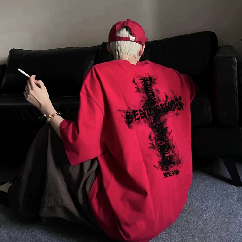 | nameOriginal | American high street burgundy short-sleeved men's summer trendy cross print heavy T-shirt high-end five-sleeve top |