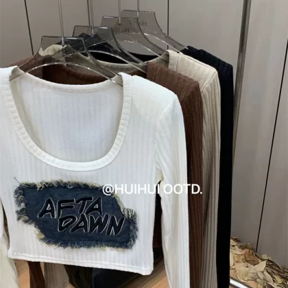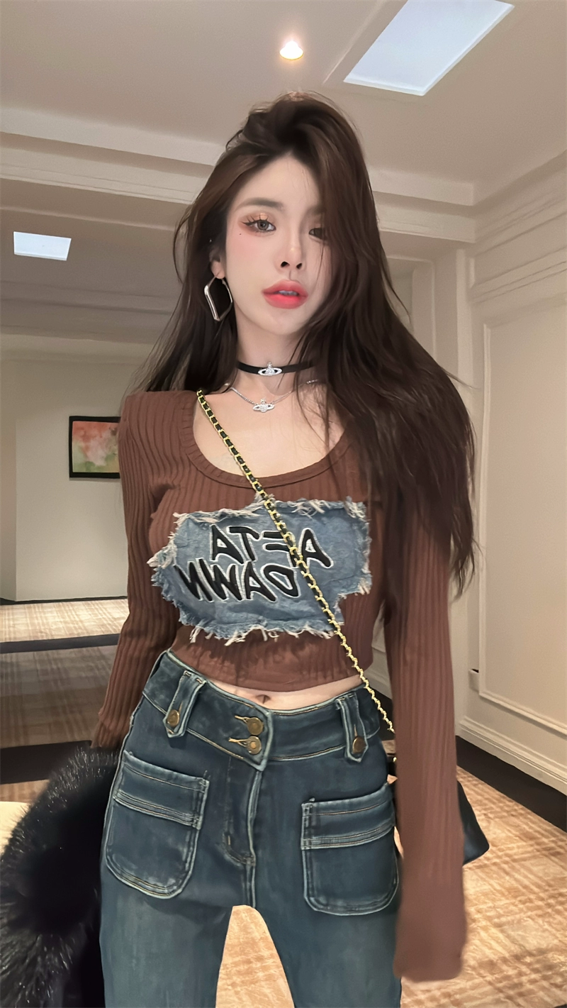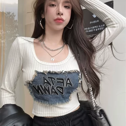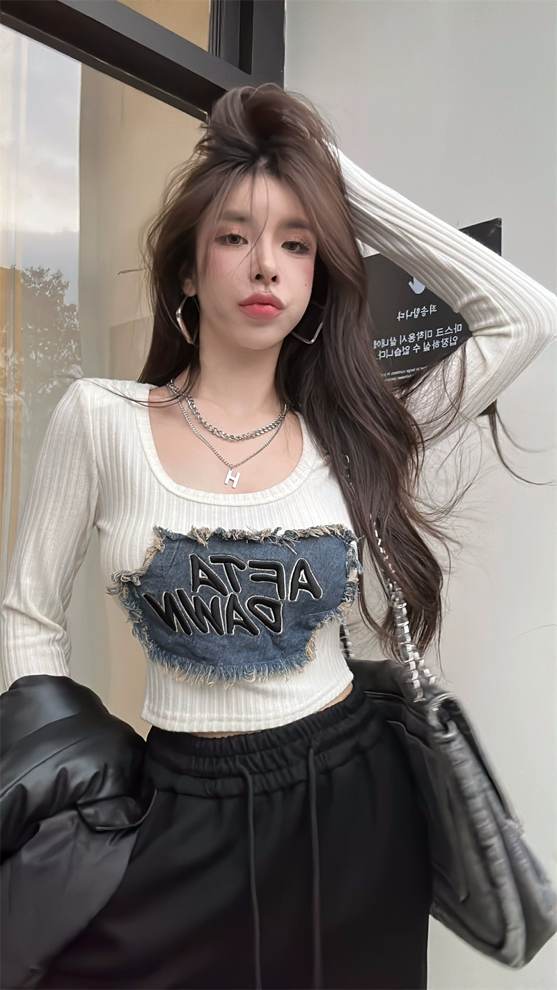 | nameOriginal | American hot girl style denim patch T-shirt 2024 spring women's shoulder pads U-neck figure-showing short bottoming shirt top |