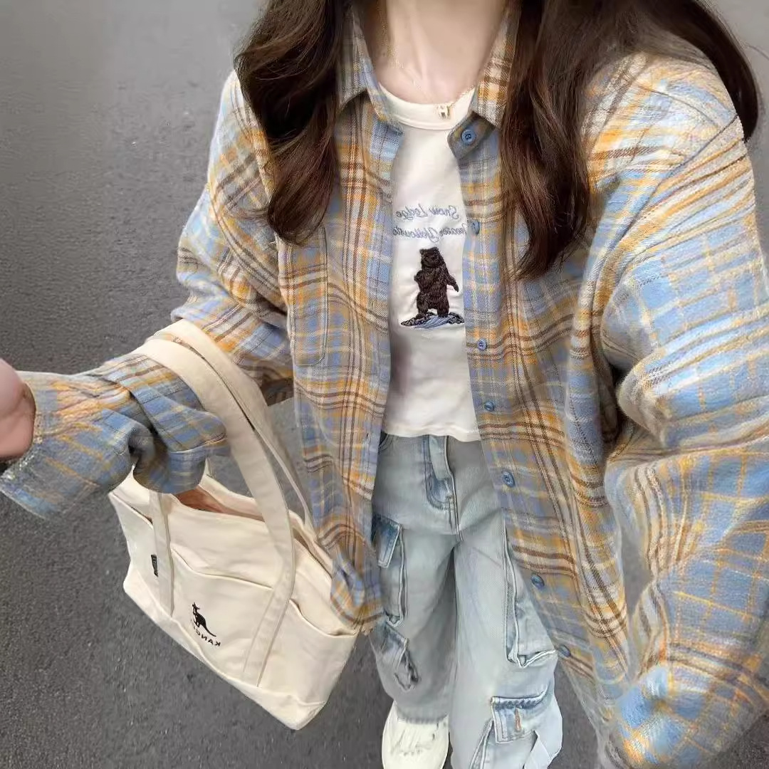 American Plaid Shirt Women’s Spring and Autumn 2024 New Loose Outer Wear Shirt Design Sense Niche Lapel Top Coat