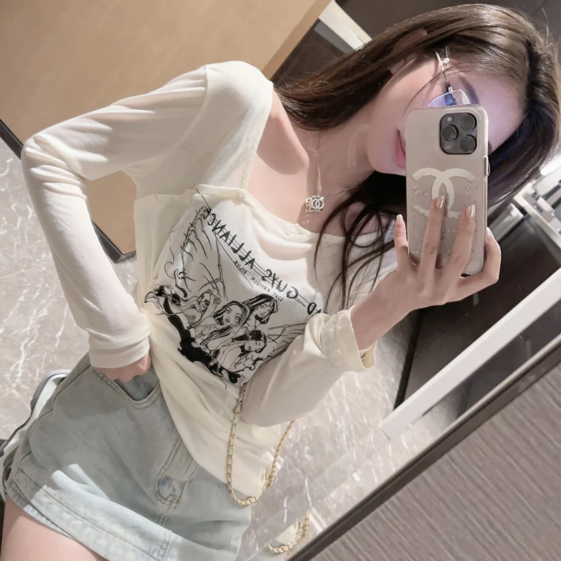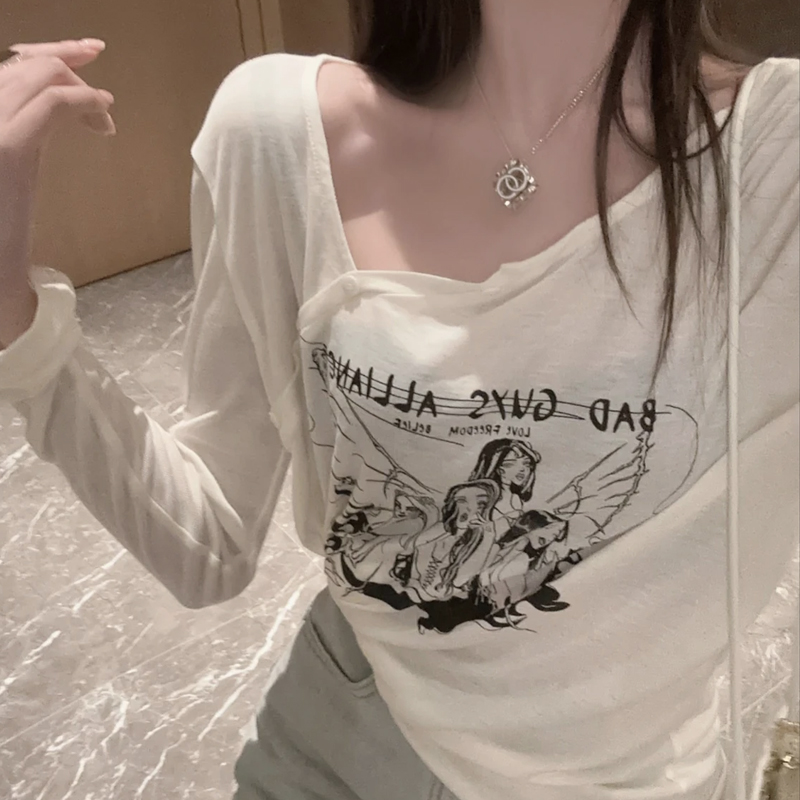 | nameOriginal | American Printed Design Buckle Irregular T-shirt Age-reducing Pure Slimming Fashionable White Thin Long-sleeved Clavicle Top |