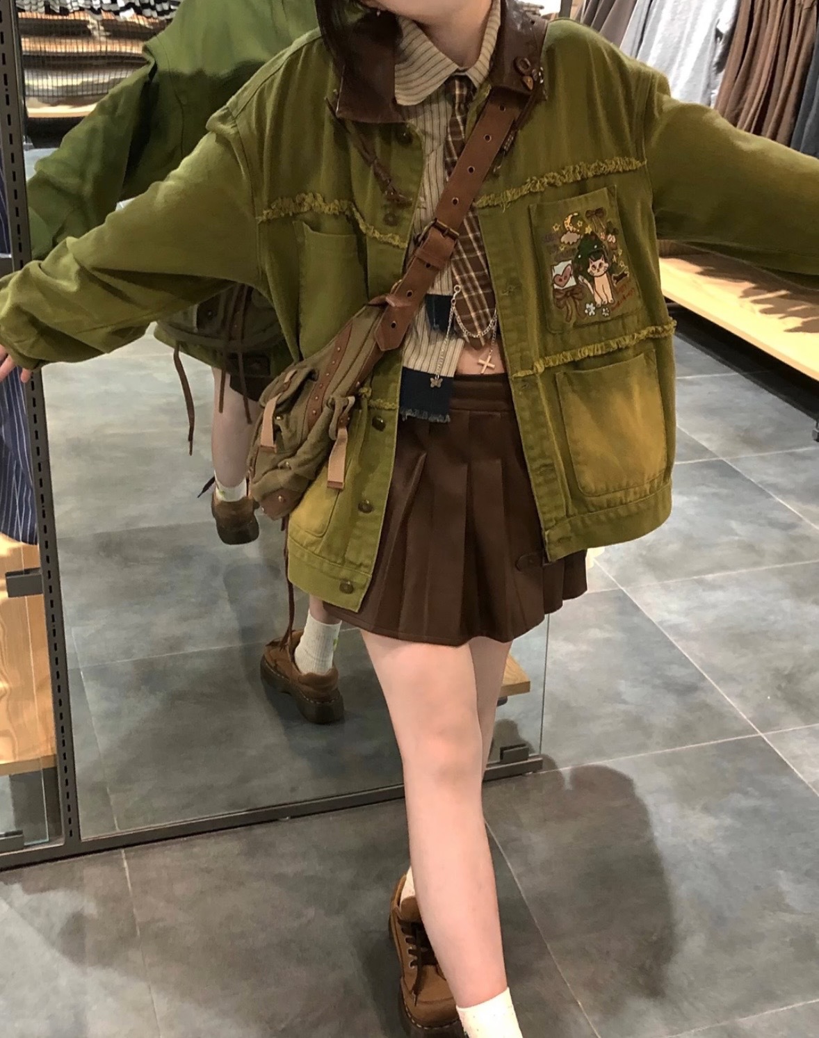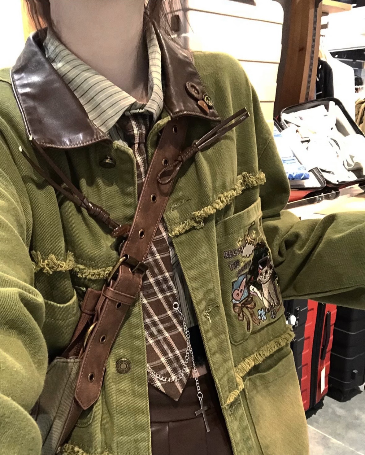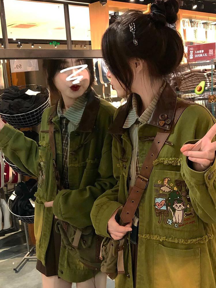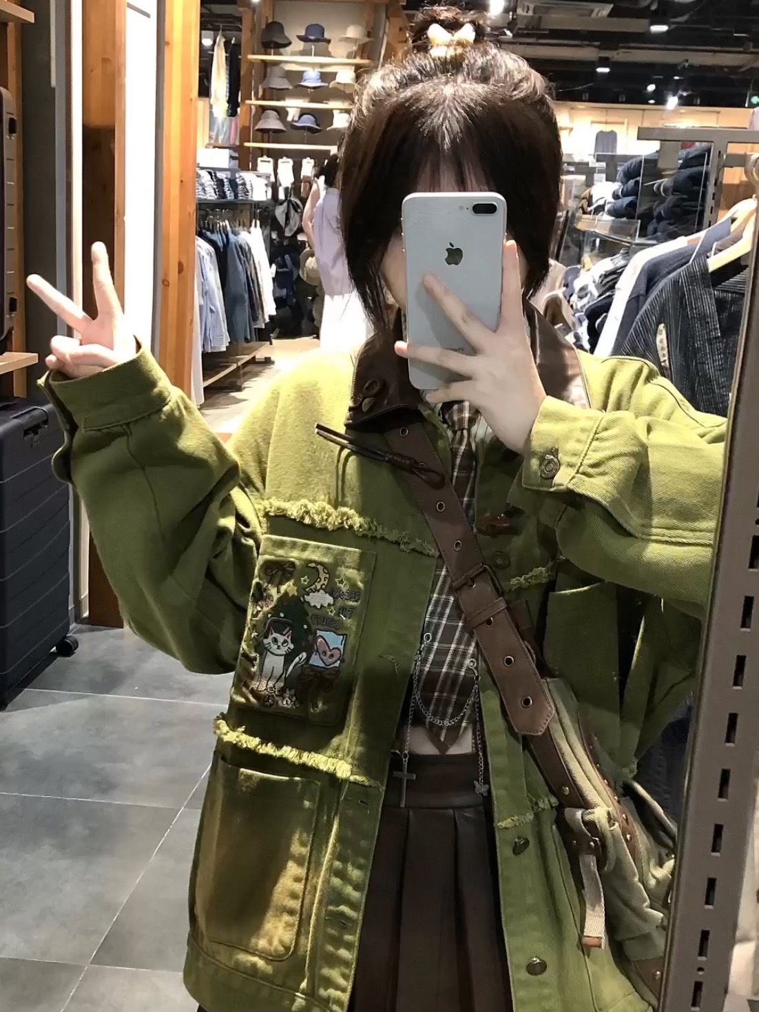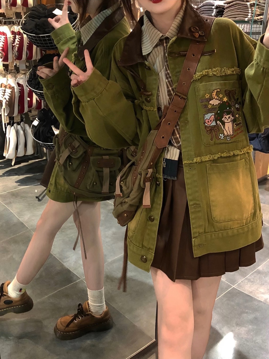 American retro avocado green stitching Denim coat women’s spring and autumn design sense niche distressed Vibe style jacket fashion