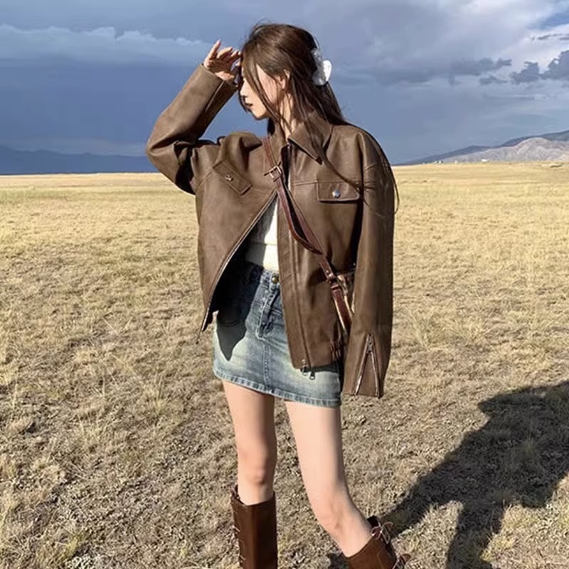 American Retro brown pu leather coat for women 2023 autumn new high-grade super nice short jacket top