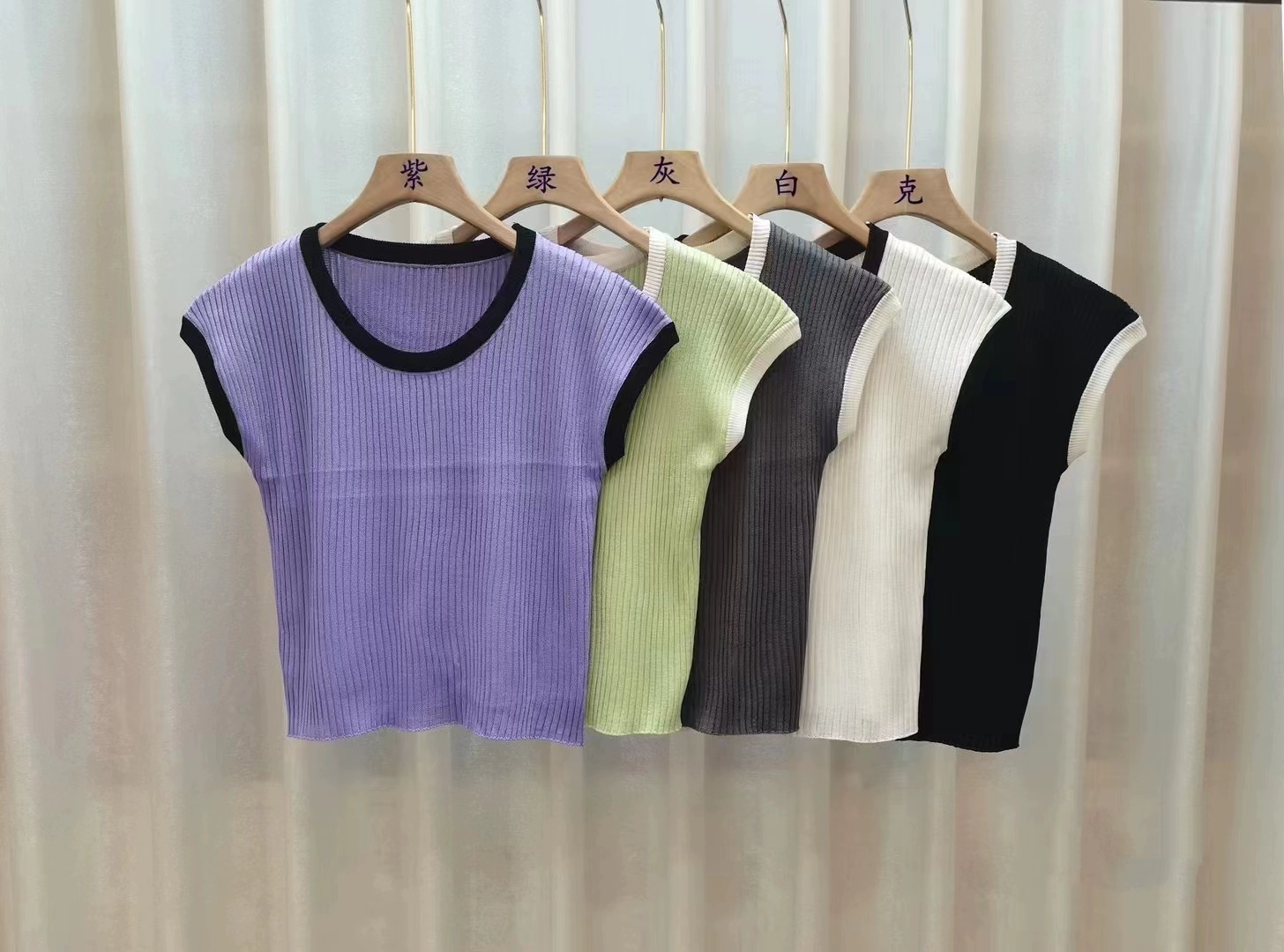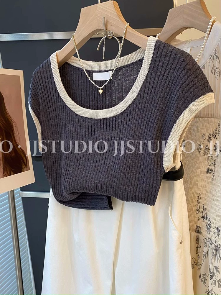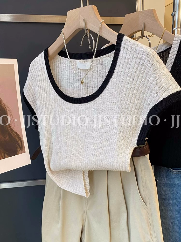 | nameOriginal | American retro contrast color short-sleeved T-shirt for women summer ice silk sweater French Hong Kong style short shoulder U-neck top |